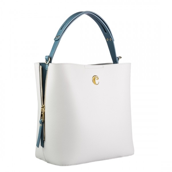 Torba damska Garance wykonana jest z eleganckiego materiału ziarnistego i dwukolorowego. Ten model wiadra składa się z dwóch elementów w jednym. Wewnętrzna kieszeń może służyć jako kosmetyczka lub mała torba na ramię dzięki odpinanemu paskowi. Torba ta wyróżnia się podwójnym podpisem i dwoma metalowymi suwakami po bokach. Jest to kobiecy, wszechstronny i nowoczesny dodatek. Dostępny jest w kolorach czarnym i szarym, jasnoszarym i niebieskim, a także w kolorze beżowym i różowym. Produkt dostarczany jest w ładnej białej bawełnianej torbie z napisem Cacharel.