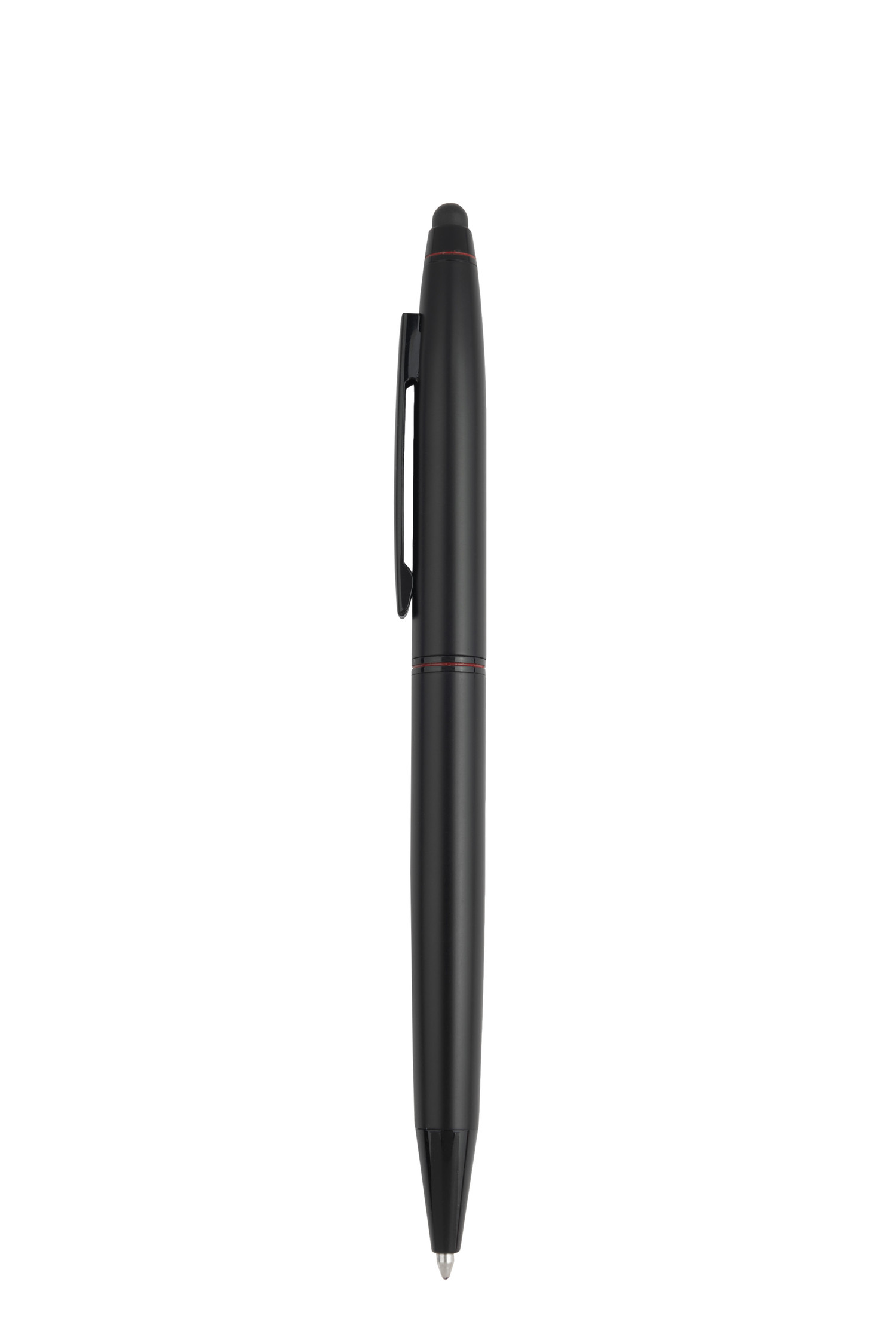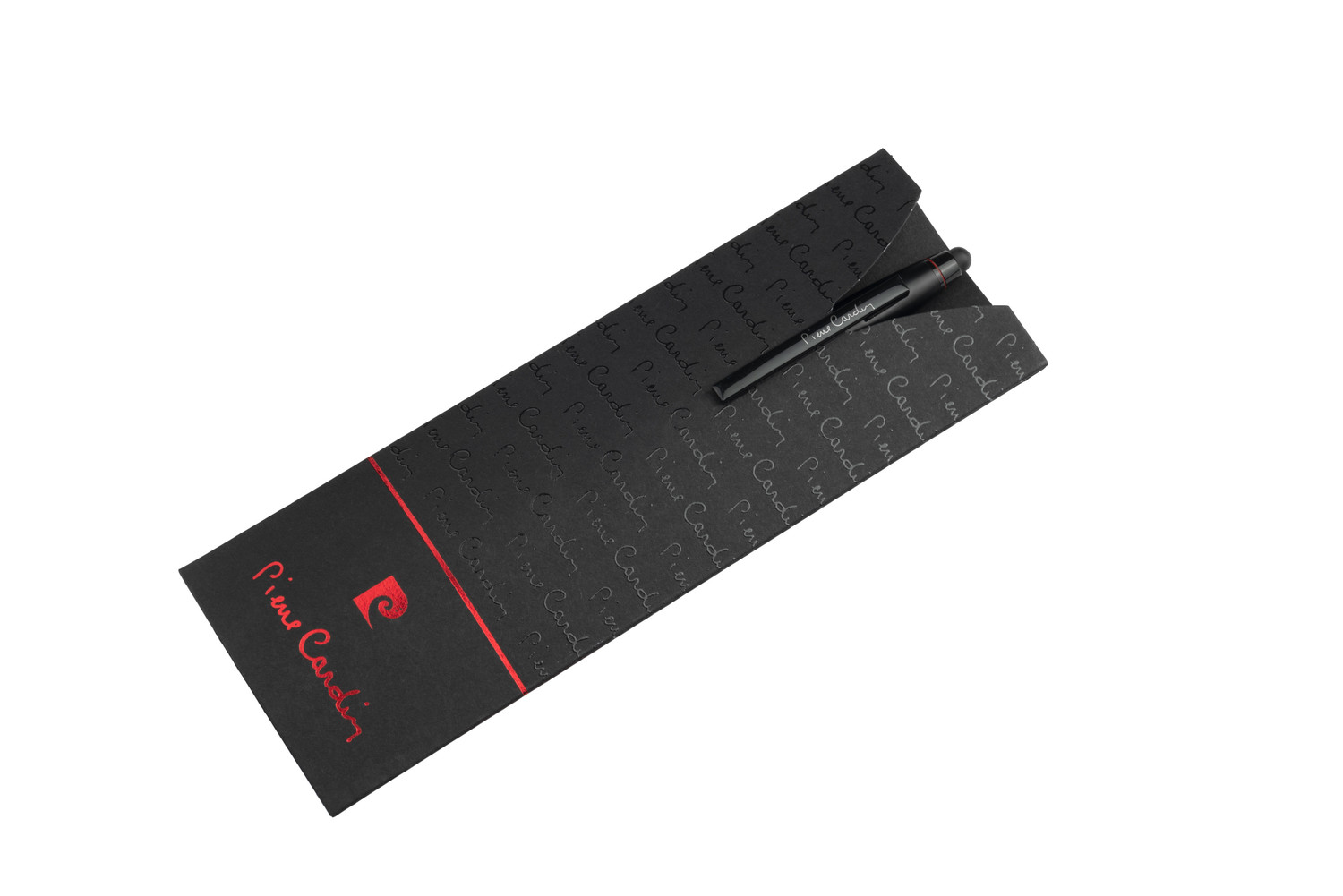 Stylowy długopis metalowy z mechanizmem obrotowym. Długopis ma czarny, matowy korpus i dwa czerwone pierścienie. Posiada wysokiej jakości niebieski wkład z końcówką 1 mm. Zapakowany w eleganckie etui prezentowe z certyfikatem autentyczności Pierre Cardin.