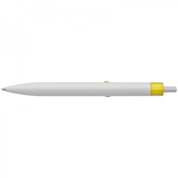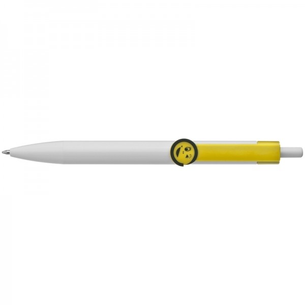 Długopis plastikowy z kolorowym klipsem ozdobionym zabawną buźką. Dostępny w kilku kolorach. Posiada wkład piszący na niebiesko.