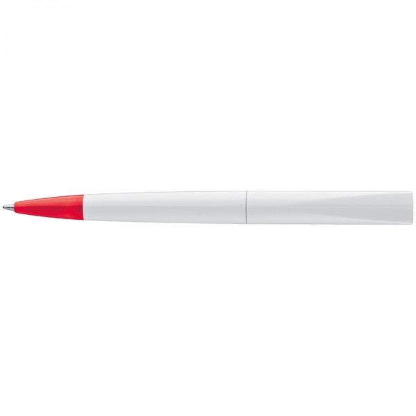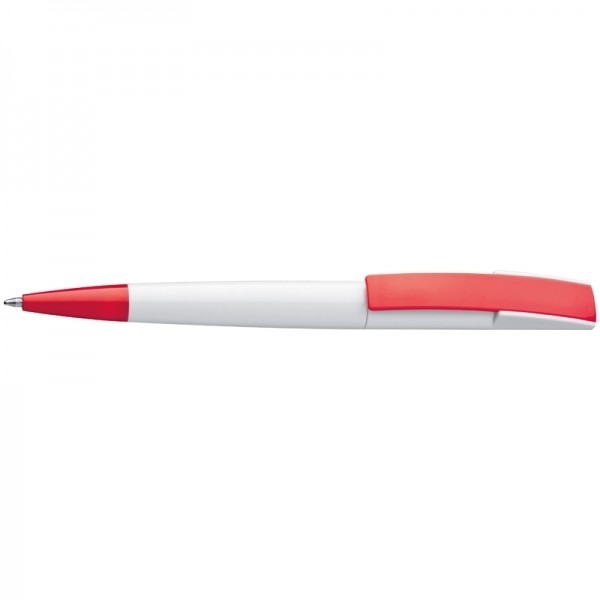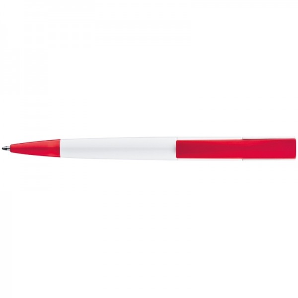 Plastikowy długopis z kolorowym, szerokim klipsem oraz mechanizmem obrotowym.