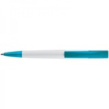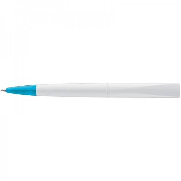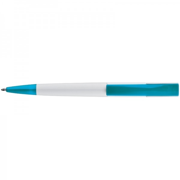 Plastikowy długopis z kolorowym, szerokim klipsem oraz mechanizmem obrotowym.