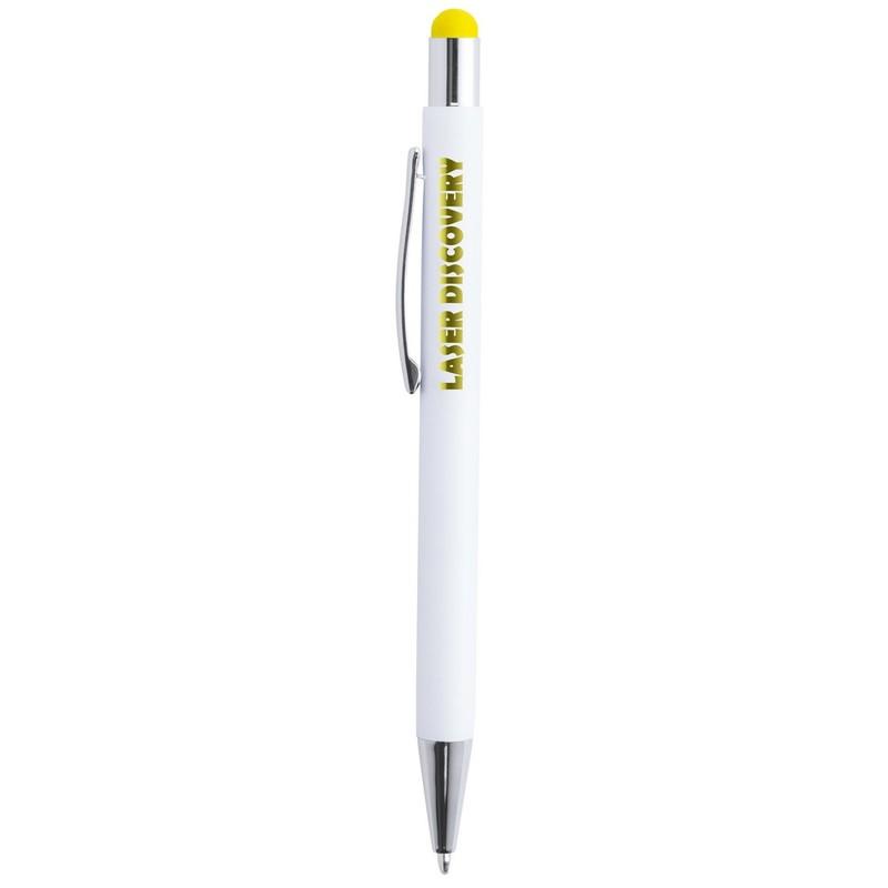 Długopis, touch pen, biały trzon, grawer ukazuje lustrzaną powierzchnię w kolorze gumowej końcówki