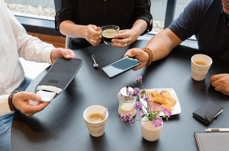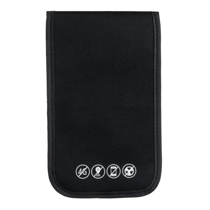 Obudowa wykonana z poliestru 600D z osłoną wewnętrzną RFID. Blokuje wszystkie sygnały komórkowe, WiFi i sygnały Bluetooth®, w tym połączenia, wiadomości i powiadomienia przychodzące w momencie, gdy telefon jest w etui. Wszystkie wiadomości głosowe, tekstowe i powiadomienia pojawią się po wyjęciu telefonu z etui. Dzięki swoim funkcjom i fizycznej barierze eliminuje potrzebę sprawdzenia telefonu podczas jazdy samochodem. Pasuje do większości smartfonów do 18 x 9 cm. Może pomieścić do 4 telefonów. Doskonale sprawdza się podczas spotkań lub kolacji.