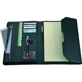 Stylowy folder format A4 wykonany ze skóry naturalnej z nowoczesnym wzorem. Posiada wewnętrzną kieszeń na tablet (rozmiar 10″), kieszeń na zamek, 5 kieszonek na wizytówki, dwie kieszenie na notatki oraz notes (25 stron), gramatura 80 g/m2. Zapakowany w eleganckie pudełko prezentowe z certyfikatem autentyczności Pierre Cardin.