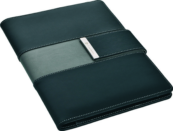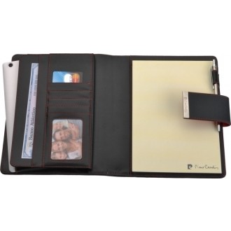 Elegancki folder wykonany z PU z magnetycznym zapięciem, kieszenią na tablet (rozmiar 8″), czterema kieszonkami na wizytówki i trzema na notatki oraz miejscem na długopis. W komplecie notatnik w linie (25 stron), gramatura 80 g/m2. Folder wykończony ozdobnymi przeszyciami, zapakowany w eleganckie pudełko prezentowe z certyfikatem autentyczności Pierre Cardin.
