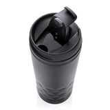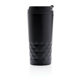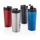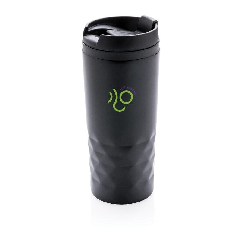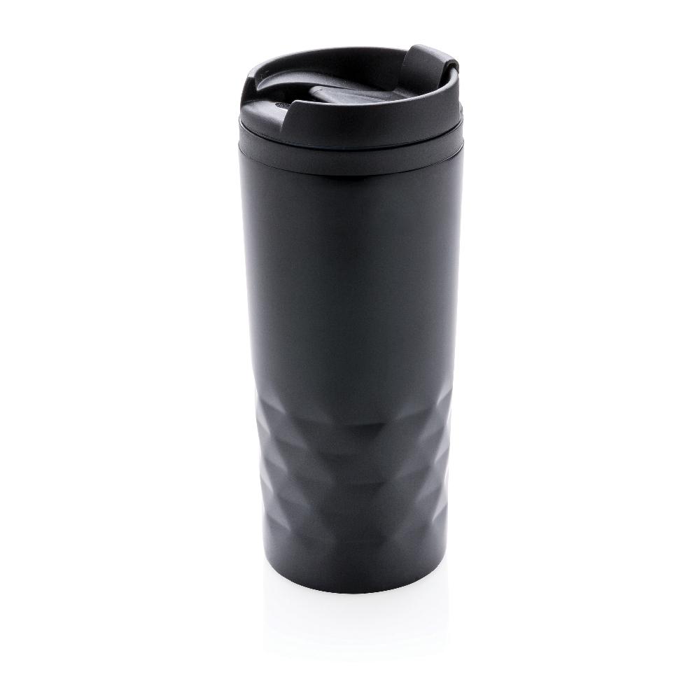 Stylowy kubek ze stali nierdzewnej z geometrycznym designem. Szczelny, pojemność 300 ml, wnętrze z plastiku. Należy myć ręcznie.