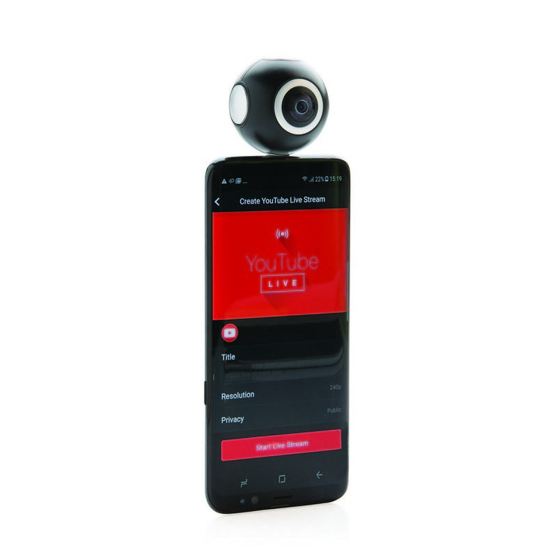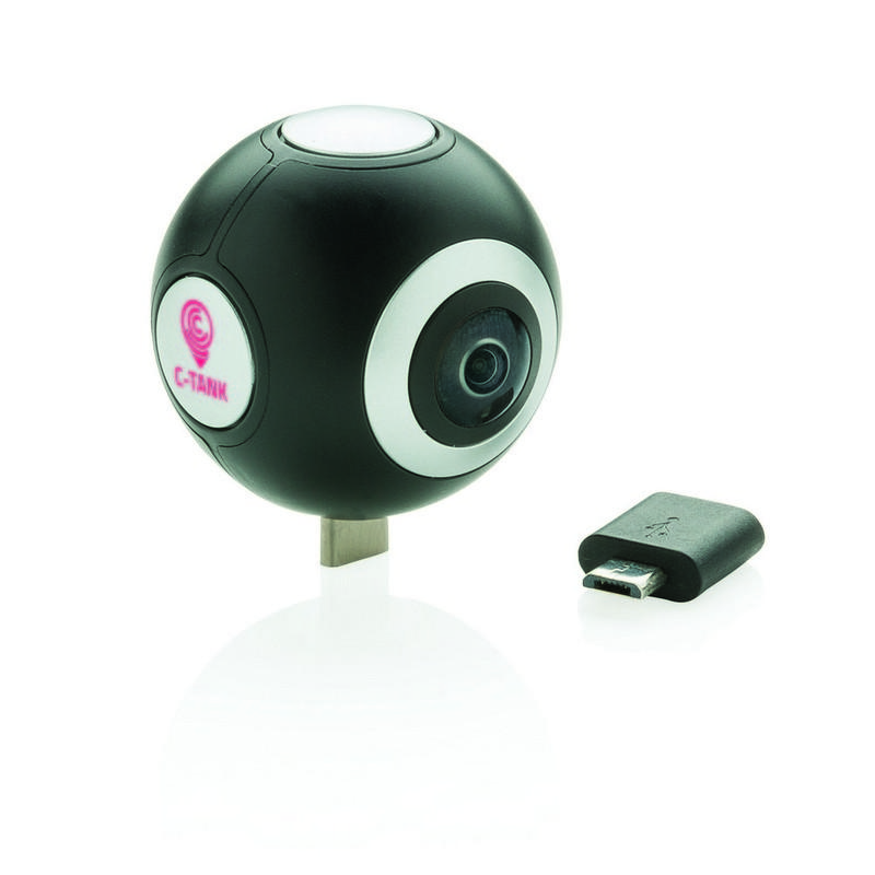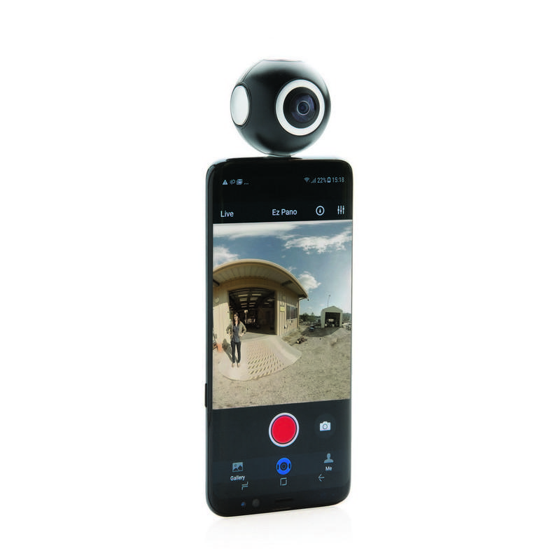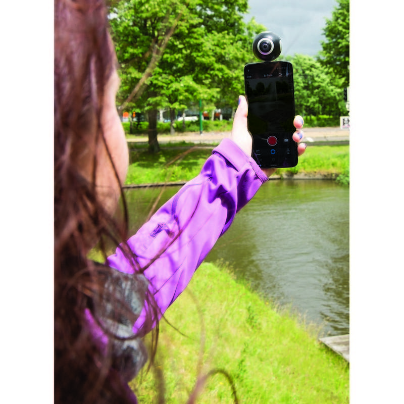Rób wspaniałe zdjęcia i filmy HD 360 stopni przy pomocy tego aparatu 360, który może z łatwością zostać umieszczony na każdym tablecie/telefonie Android. Darmowa aplikacja pozwala na przesyłanie zdjęć na żywo do kanałów social media takich jak Facebook, Twitter, Instagram lub YouTube. Umożliwia także edycję zdjęć i filmów oraz tworzenie własnych filmów VR. W komplecie złącze micro USB, które może być wymienione na złącze typu C do najnowszej generacji urządzeń Android. Rozdzielczość: filmy 2K (2048x1024); zdjęcia: 3K (3508x1504).