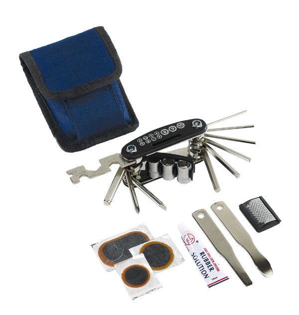 Praktyczny komplet narzędzi rowerowych ze stali nierdzewnej , pakowany w podręczne etui.