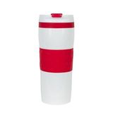 Kubek termiczny 330 ml Air Gifts, z kolorową silikonową opaską, miedziana izolacja próżniowa, podwójne ścianki ze stali nierdzewnej z próżnią między ściankami, dzięki czemu zachowuje funkcje termosu i długo utrzymuje temperaturę nie oddając jej na zewnątrz, plastikowe wieczko, szczelne zamknięcie, nie wymaga obsługi oburącz, błyszczące wykończenie