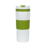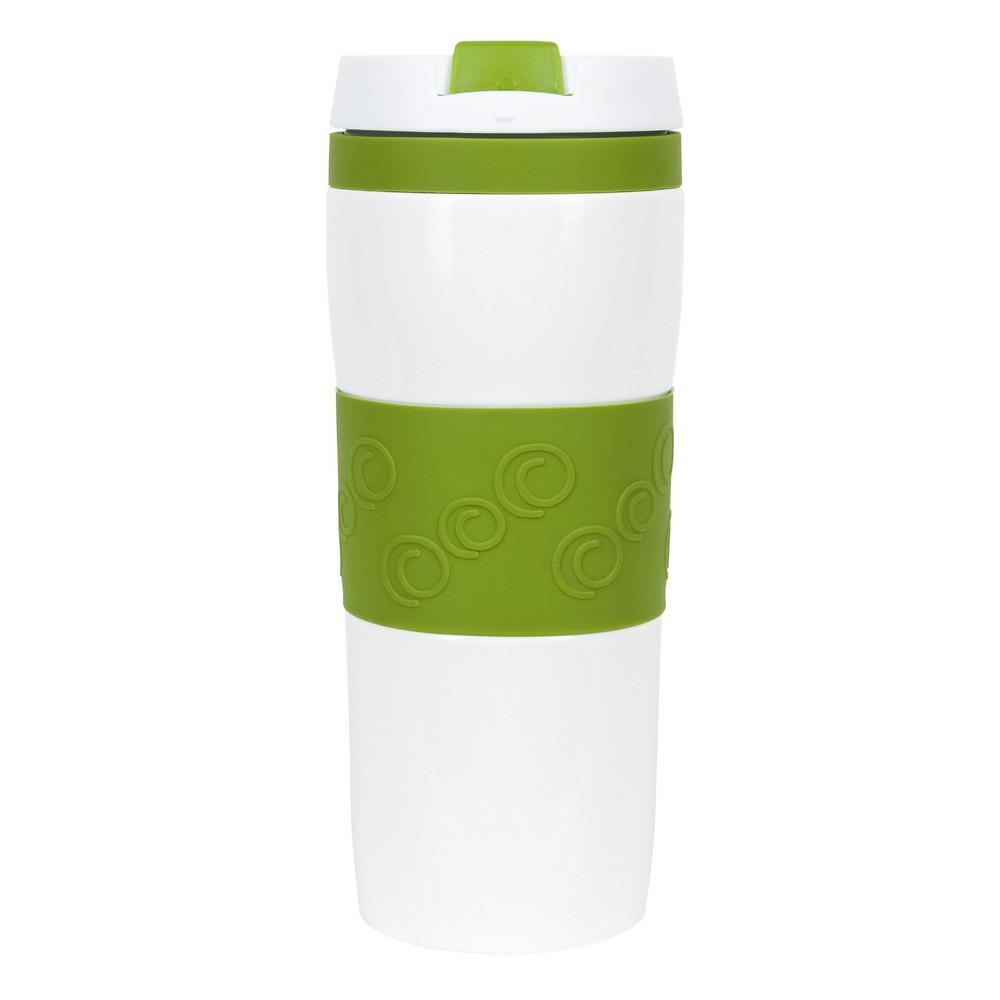 Kubek termiczny 330 ml Air Gifts, z kolorową silikonową opaską, miedziana izolacja próżniowa, podwójne ścianki ze stali nierdzewnej z próżnią między ściankami, dzięki czemu zachowuje funkcje termosu i długo utrzymuje temperaturę nie oddając jej na zewnątrz, plastikowe wieczko, szczelne zamknięcie, nie wymaga obsługi oburącz, błyszczące wykończenie