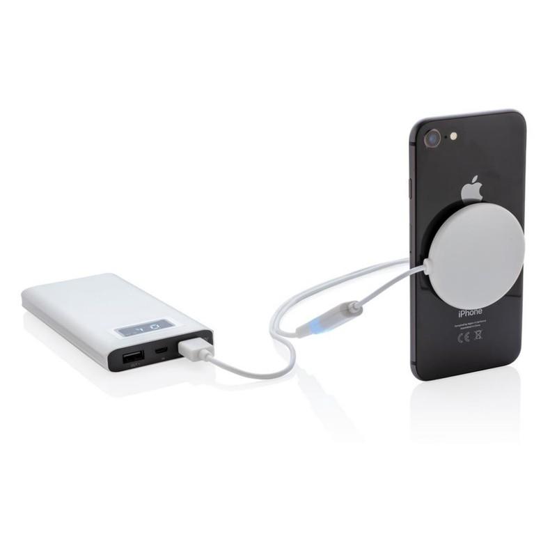 Ładowarka bezprzewodowa 5W z przyssawkami, wykonana z ABS, ładowarkę można przyczepić do tylnej części telefonu, podczas korzystania z telefonu w pozycji pionowej kabel nie przeszkadza w użytkowaniu, bezprzewodowe ładowanie jest kompatybilne ze wszystkimi urządzeniami posiadającymi możliwość ładowania indukcyjnego, wejście 5V/1.5A, wyjście bezprzewodowe 5V/1A 5W, kabel micro USB 120 cm w komplecie