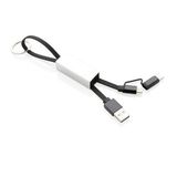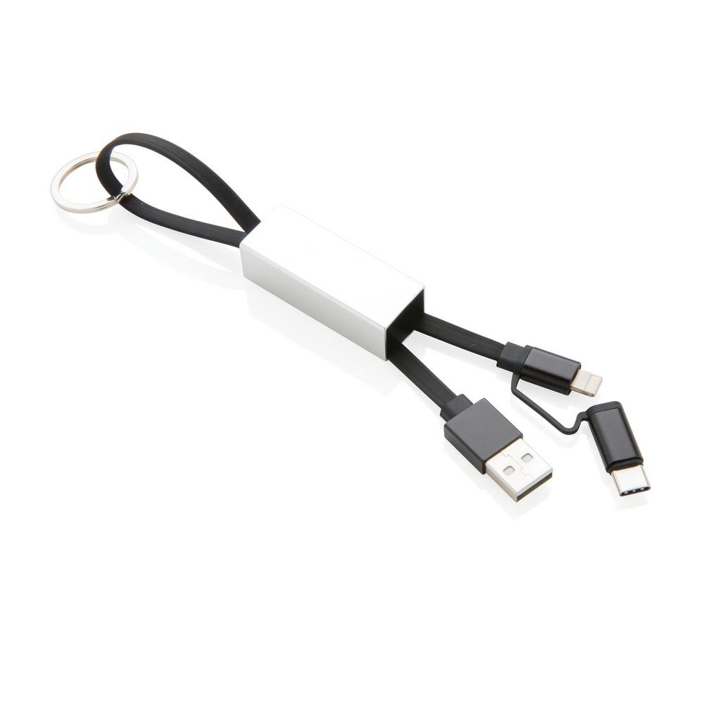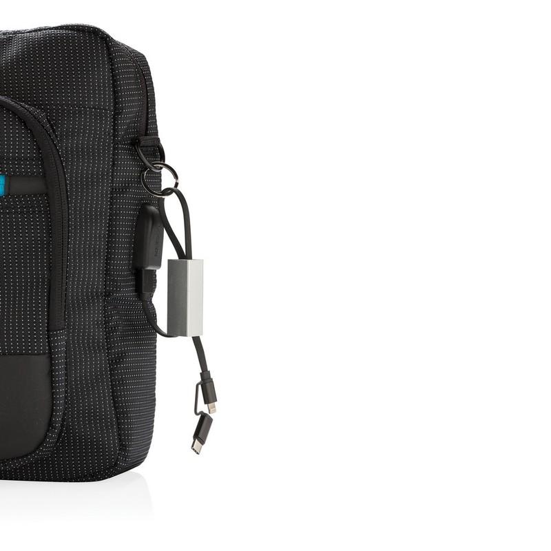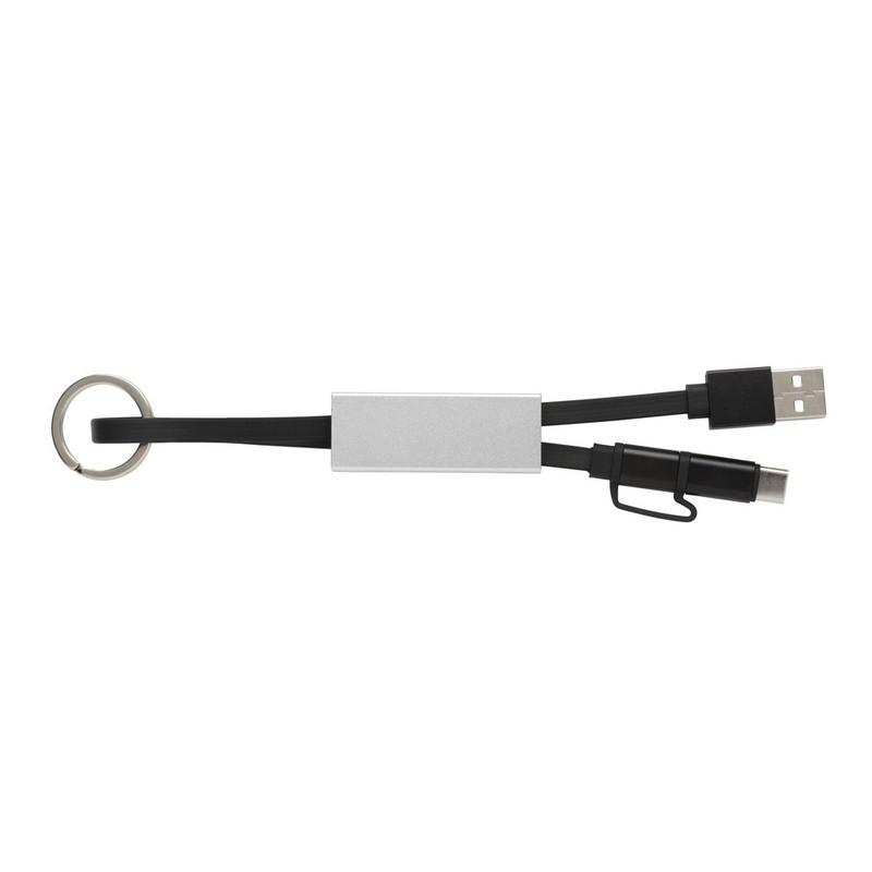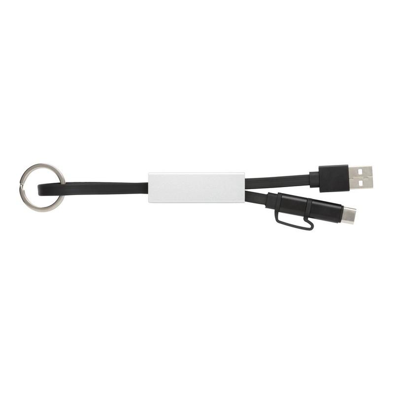 Nowoczesny kabel do ładowania 3 w 1 z końcówką USB typu C, oraz dwustronną końcówką, którą można naładować urządzenia iOS i Android (micro USB). Kabel wykonany z TPU z końcówkami wykonanymi z aluminium oraz aluminiowe etui ochronne. W komplecie brelok do kluczy. Kabel nadaje się do ładowania oraz do synchronizacji. Długość 15 cm.