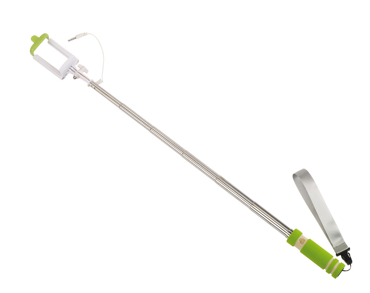 Monopod teleskopowy SELFIE MINI do robienia samodzielnych zdjęć smartfonem do 8,5 cm szerokości, kabel z końcówką "jack" podłączany do gniazda audio w telefonie, przycisk wyzwalacza w rączce, kompatybilny z ANDROID 4.1.2 i iOS 5.0 oraz nowszymi wersjami (zależnie od ustawień), przy innych wersjach przycisk może być aktywowany przez aplikację foto, teleskopowy drążek wydłużany z ok. 23 cm do ok. 61 cm, uchwyt z kątem nachylenia do ok. 270 stopni, kolorowa gumowo-piankowa rączka z możliwym do oznakowania odczepianym paskiem na nadgarstek.