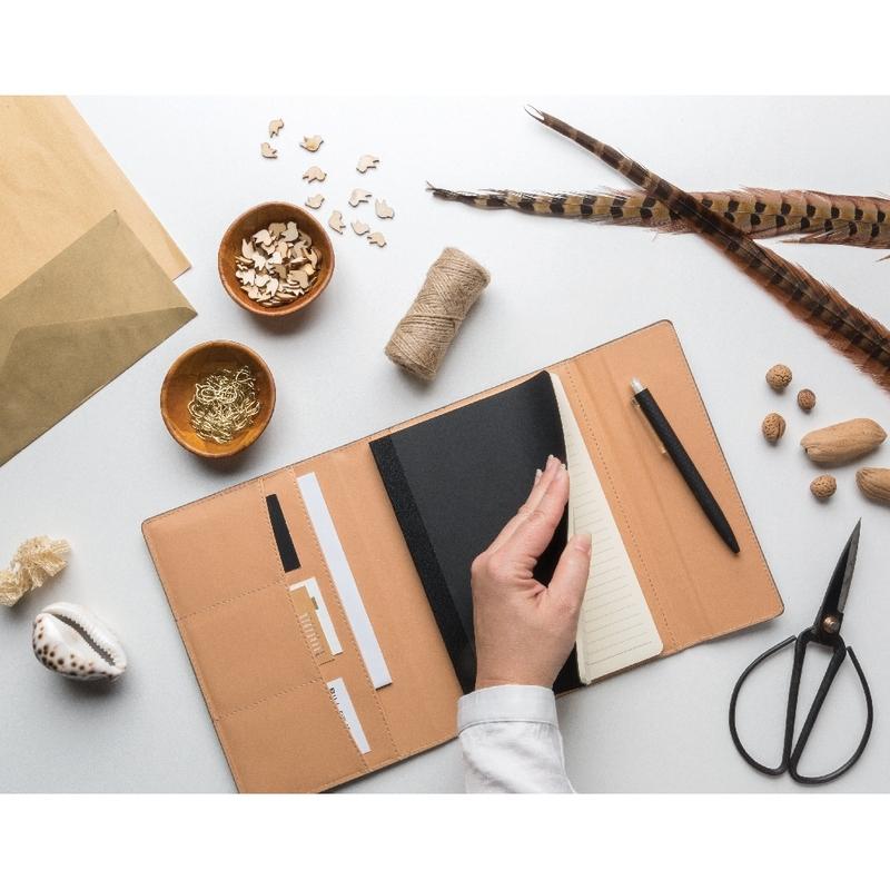 Notatnik A5, okładka wielokrotnego użytku z magnetycznym zamknięciem i miejscem na długopis, 3 miejscami na karty i 1 większą kieszenią. Wewnątrz 64 kartki 80g/m2 w kolorze kremowym.