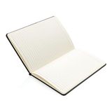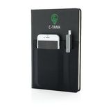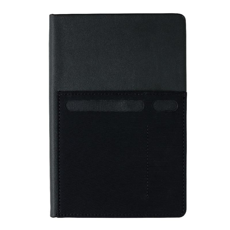 Notatnik A5, okładka ma przydatne kieszenie, w tym kieszeń na telefon (8 cm, pomieści iPhone 7 plus), miejsce na długopis oraz duży pokrowiec na dokumenty. Wewnątrz 80 kartek 80g/m2 w kolorze kremowym.