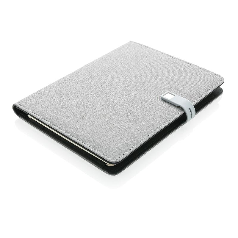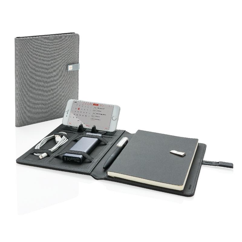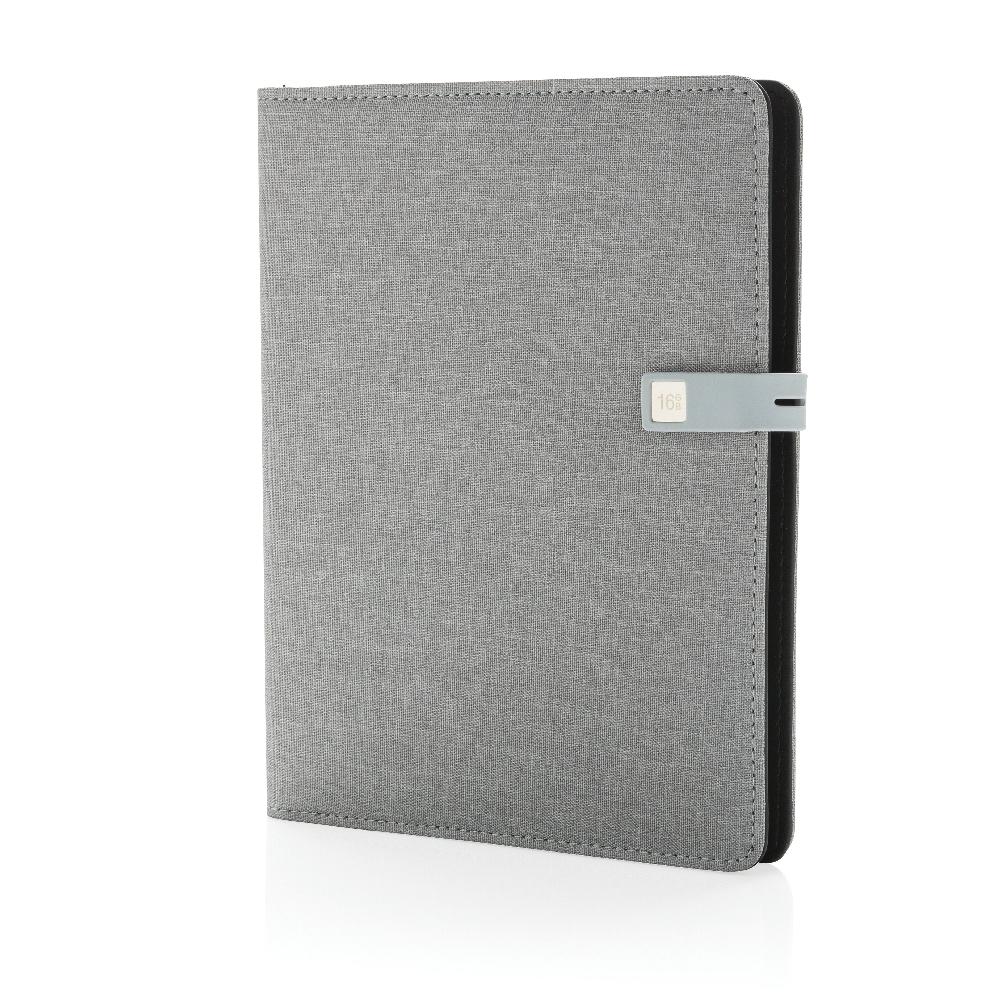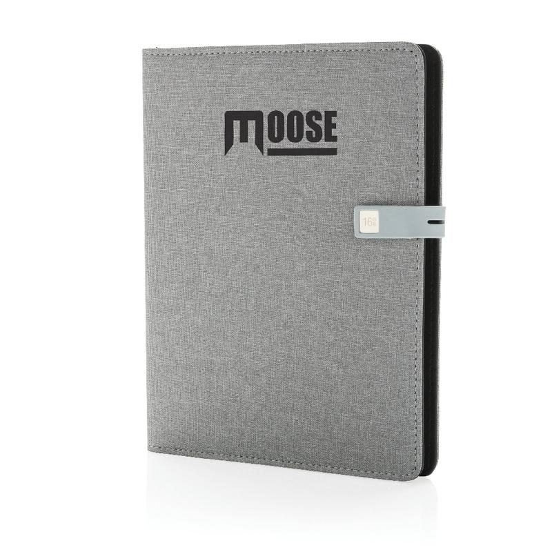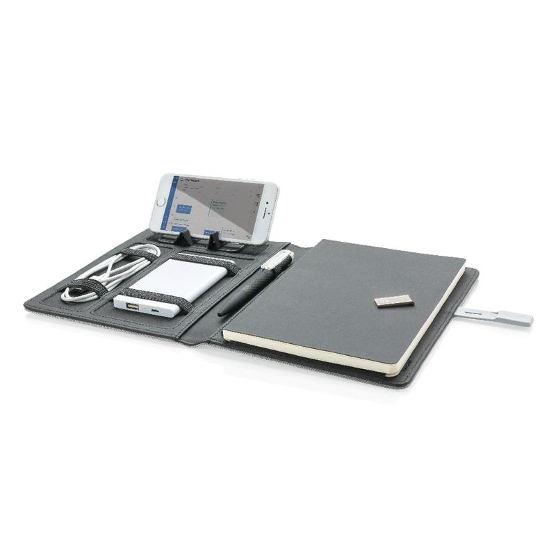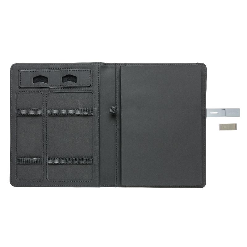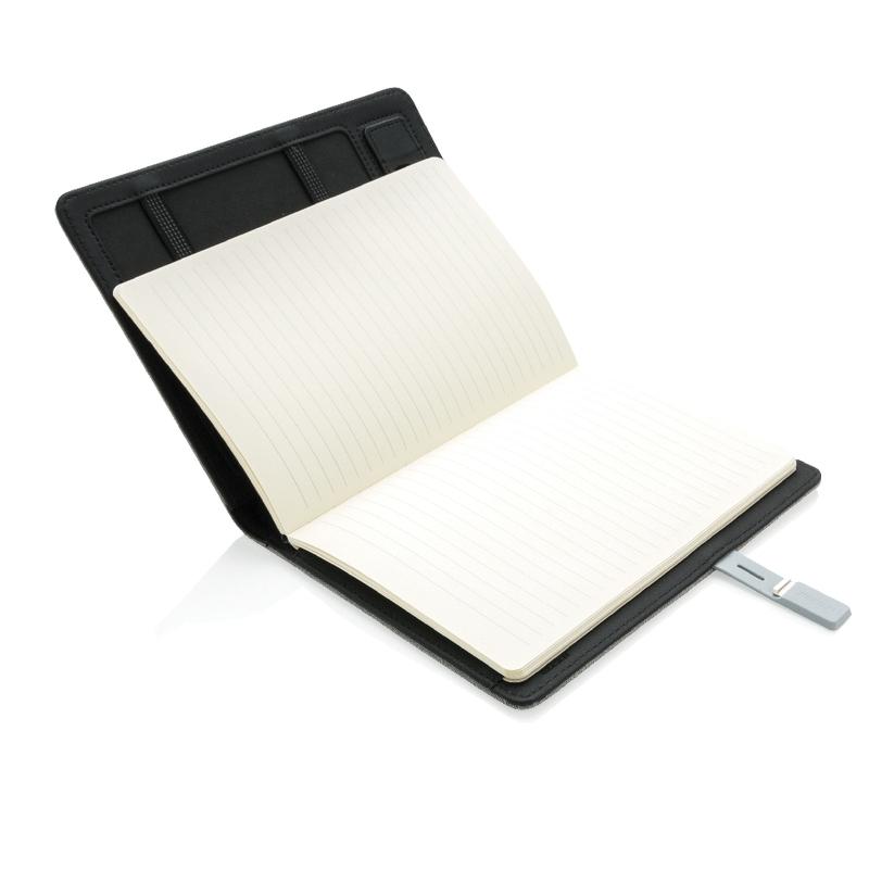 Notatnik A5 ze stojakiem na telefon, miejscem na akcesoria oraz wyjmowaną pamięcią USB 2.0 16 GB wewnątrz magnetycznego zamknięcia. Wewnątrz 64 kartki 80g/m2 w kolorze kremowym. Wzór zastrzeżony®