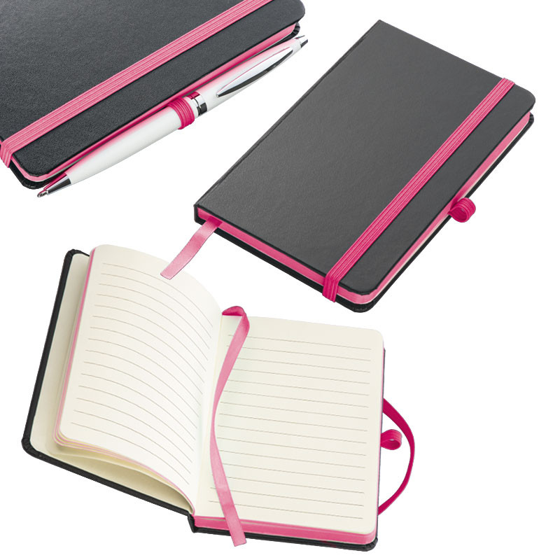 Kolorowy i elegancki notes z czarną okładką ze skóry ekologicznej, zawiera 160 stron w linię. Swój wyjątkowy wygląd zawdzięcza kolorowym brzegom kartek, specjalnej gumce na długopis z boku oraz zakładce z tasiemki. Twoje logo nadrukujemy na okładce. Pojedynczo pakowane w woreczek foliowy.