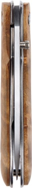 Nóż kieszonkowy z drewnianą rękojeścią i sprzączką. Materiał: metal, drewno.