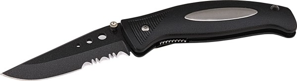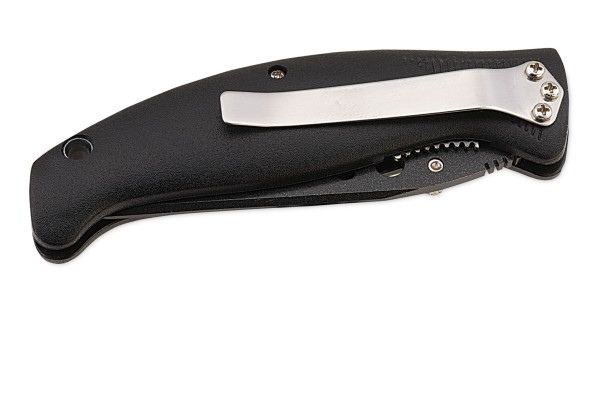 Składany nóż Schwarzwolf z plastikową rękojeścią, klipsem oraz blokadą bezpieczeństwa. Materiał: stal nierdzewna i plastik.