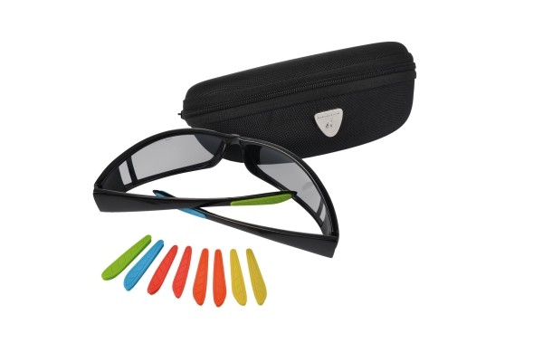 Okulary przeciwsłoneczne Schwarzwolf w czarnym pokrowcu z mikrofibry oraz twardym etui, ciemnoszare soczewki UV 400, czarne plastikowe oprawki. Gumowe części w pięciu różnych kolorach w zestawie. Okulary przeciwsłoneczne Schwarzwolf w czarnym pokrowcu z mikrofibry oraz twardym etui, ciemnoszare soczewki UV 400, czarne plastikowe oprawki. Gumowe części w pięciu różnych kolorach w zestawie.