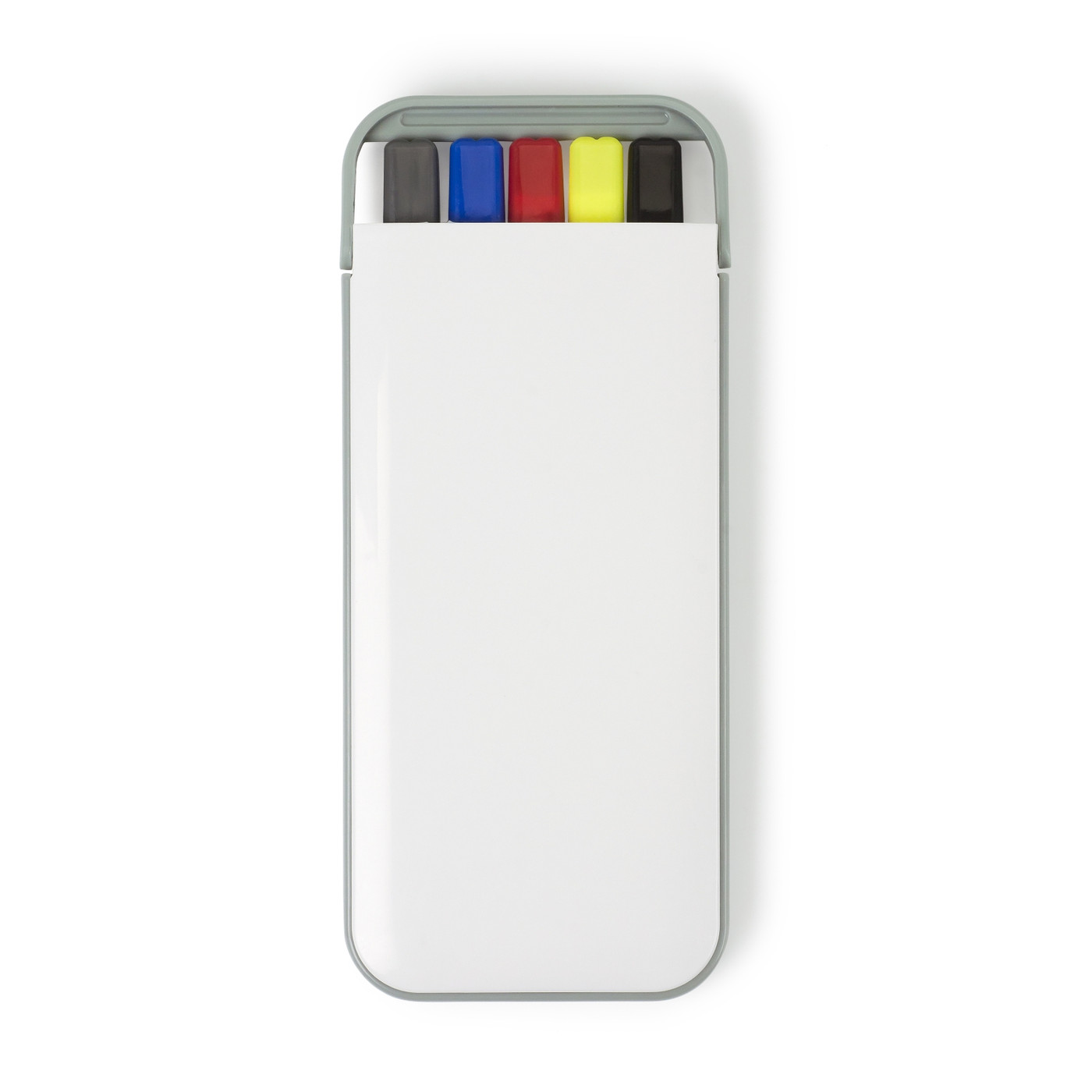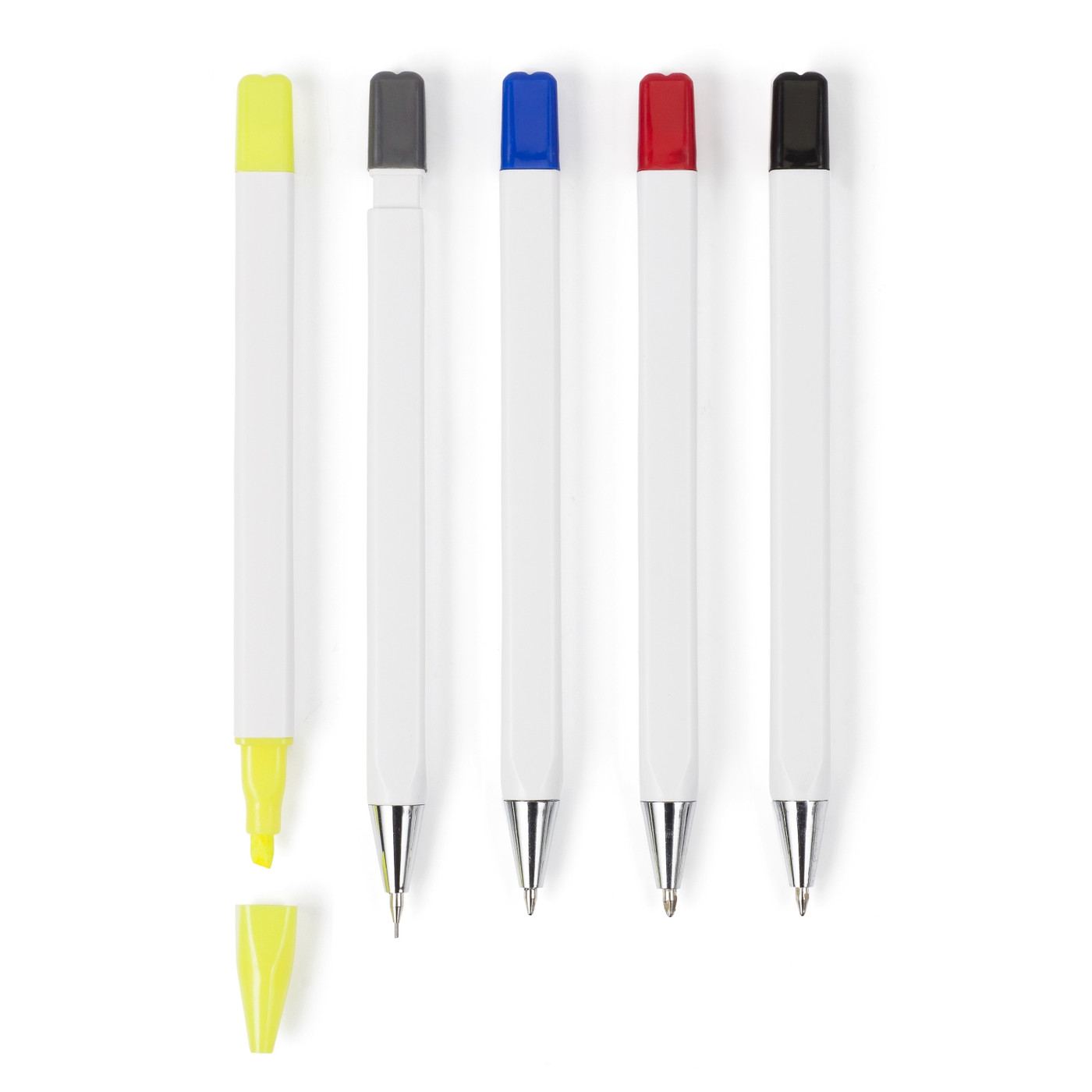 Ołówek, zakreślacz oraz 3 długopisy z wkładem w kolorze nakrętki, w plastikowym etui