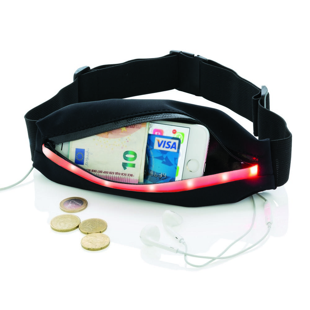Wykonany z elastycznego, odpornego na deszcz materiału oraz wodoodpornego zamka błyskawicznego pasek do biegania. Posiada wbudowaną lampkę, zwiększającą widoczność podczas uprawiania sportu wieczorem. Lampka ma 3 tryby działania, które można ustawić według indywidualnych preferencji. Pasek jest regulowany, odpowiedni do wszystkich rozmiarów. Bateria w komplecie.