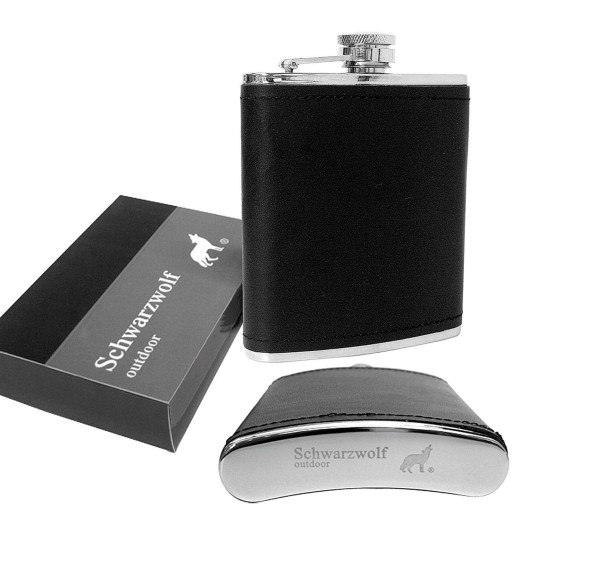 Piersiówka Schwarzwolf. Materiał: stal nierdzewna pokryta czarną skórą. Objętość: 180 ml.