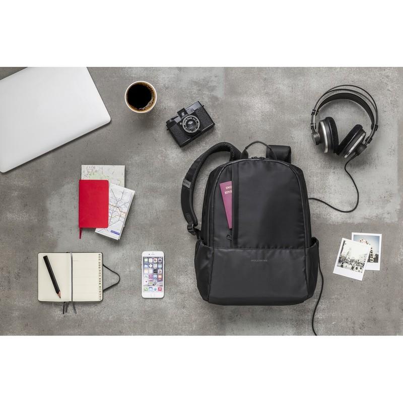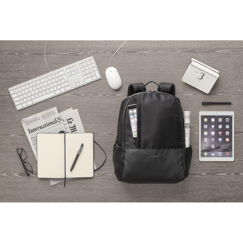 Plecak na laptopa 15" MOLESKINE Business, przegroda główna oraz 2 kieszenie przednie na zamek błyskawiczny, średnia kieszeń z licznymi przegródkami, przegroda główna z miękką przegrodą na laptopa oraz na tablet i miejscami na długopisy, pasek do zamocowania na torbie podróżnej, kieszeń na zamek błyskawiczny na plecach, miękkie plecy i paski na ramię, 2 kieszenie boczne
