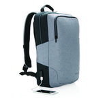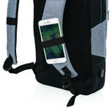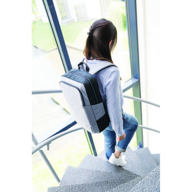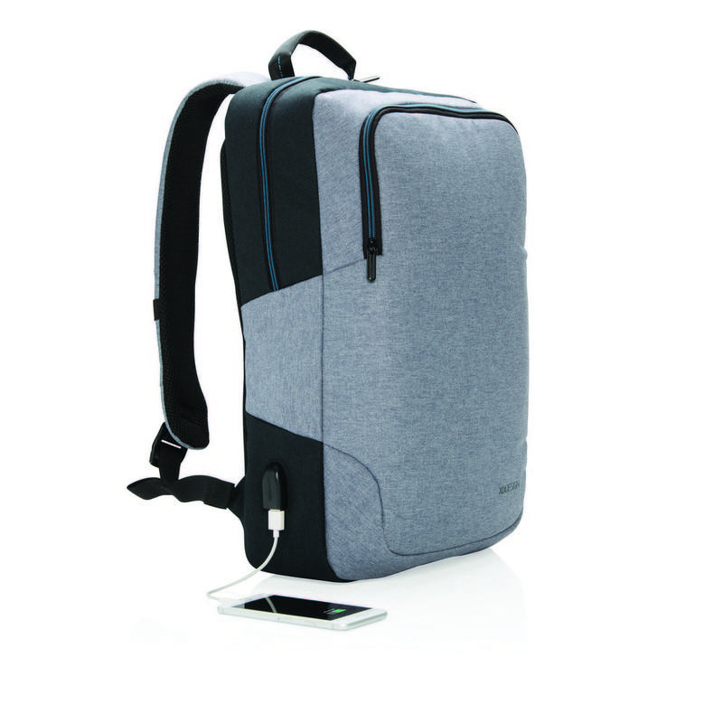 Nowoczesny plecak na laptopa 15" z dużą główną przegrodą na laptopa oraz przednią przegrodą. Innowacyjne rozwiązanie przytrzyma telefon na paskach bez konieczności używania rąk. Z łatwością można podłączyć power bank do zintegrowanego portu USB i naładować telefon lub tablet w drodze. Wzór zastrzeżony®