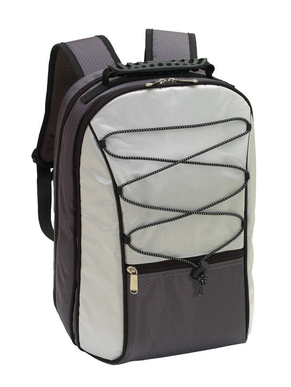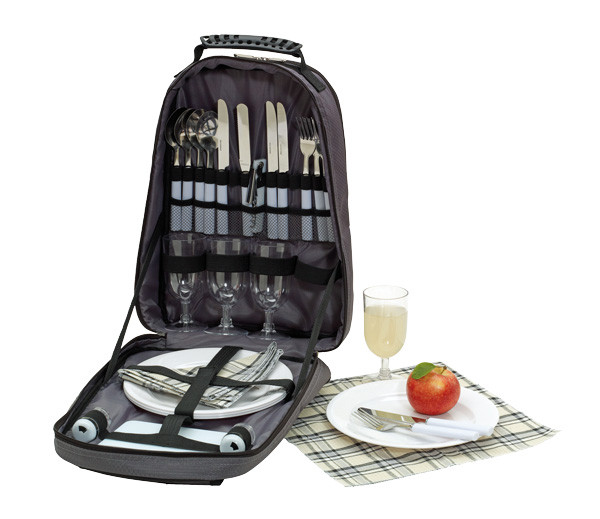 Plecak piknikowy COOLNESS zawiera kieszeń termoizolacyjną na napoje i żywność, z przodu elestyczny pasek na koc. Plecak posiada zestaw naczyń i sztućców dla 4 osób, wykonany z 420D diamentu i 840 żakardu.