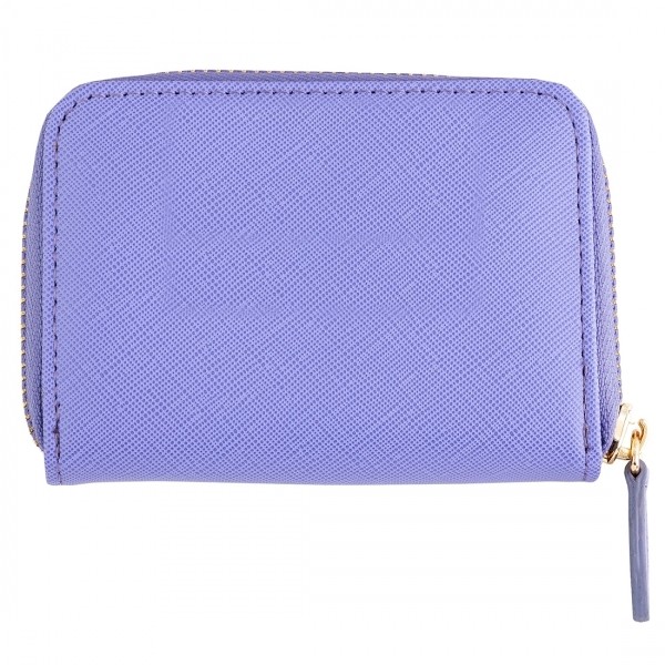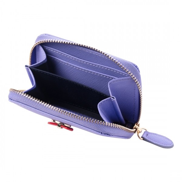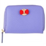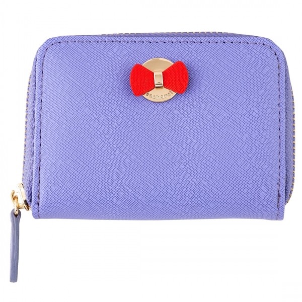 Portfel mini Hortense wykonany jest w fakturze ziarna szafranu i ozdobiony jest ładną metalową płytką z napisem Cacharel z kontrastowym kolorowym kokardką. Posiada zapinany na zamek błyskawiczny schowek na monety i miejsce do ich przechowywania. Portfel ten jest dostępny w kolorze niebieskim i różowym z kontrastującą bawełnianą podszewką.