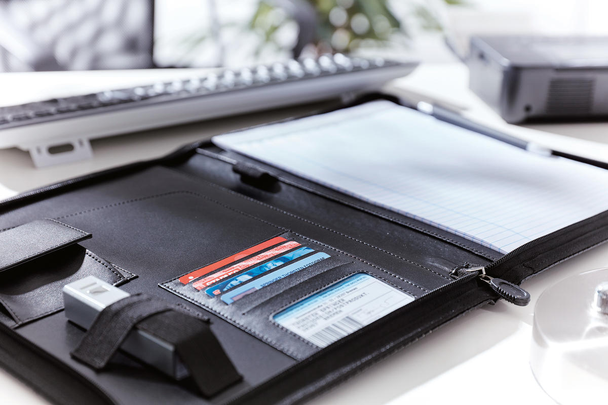 Portfolio HILL DALE w formacie A5, wewnątrz różne wsuwane kieszonki, zawiera notes w linie, pętelkę na długopis – na zewnątrz perforowany wzór, z metalową płytką na Twoje logo.