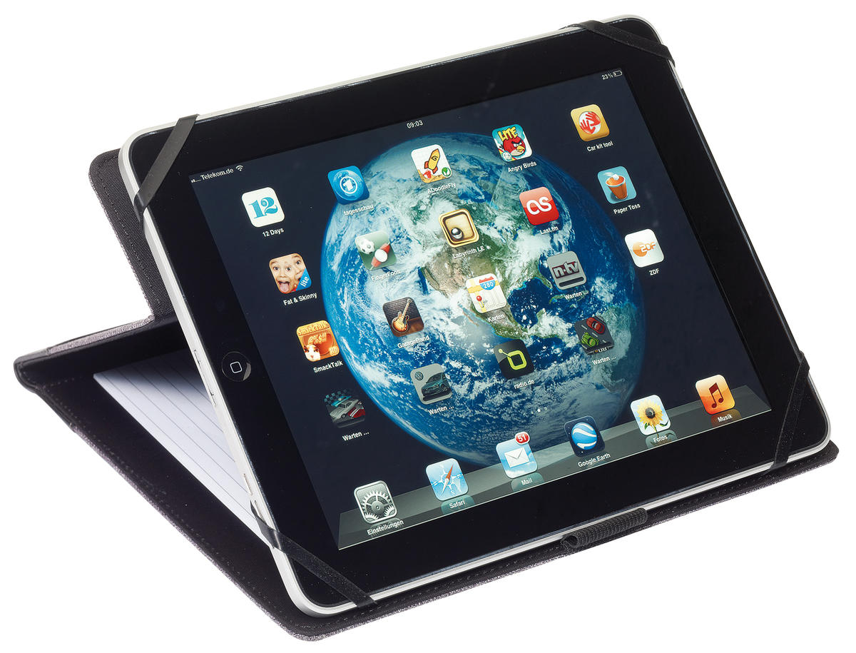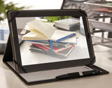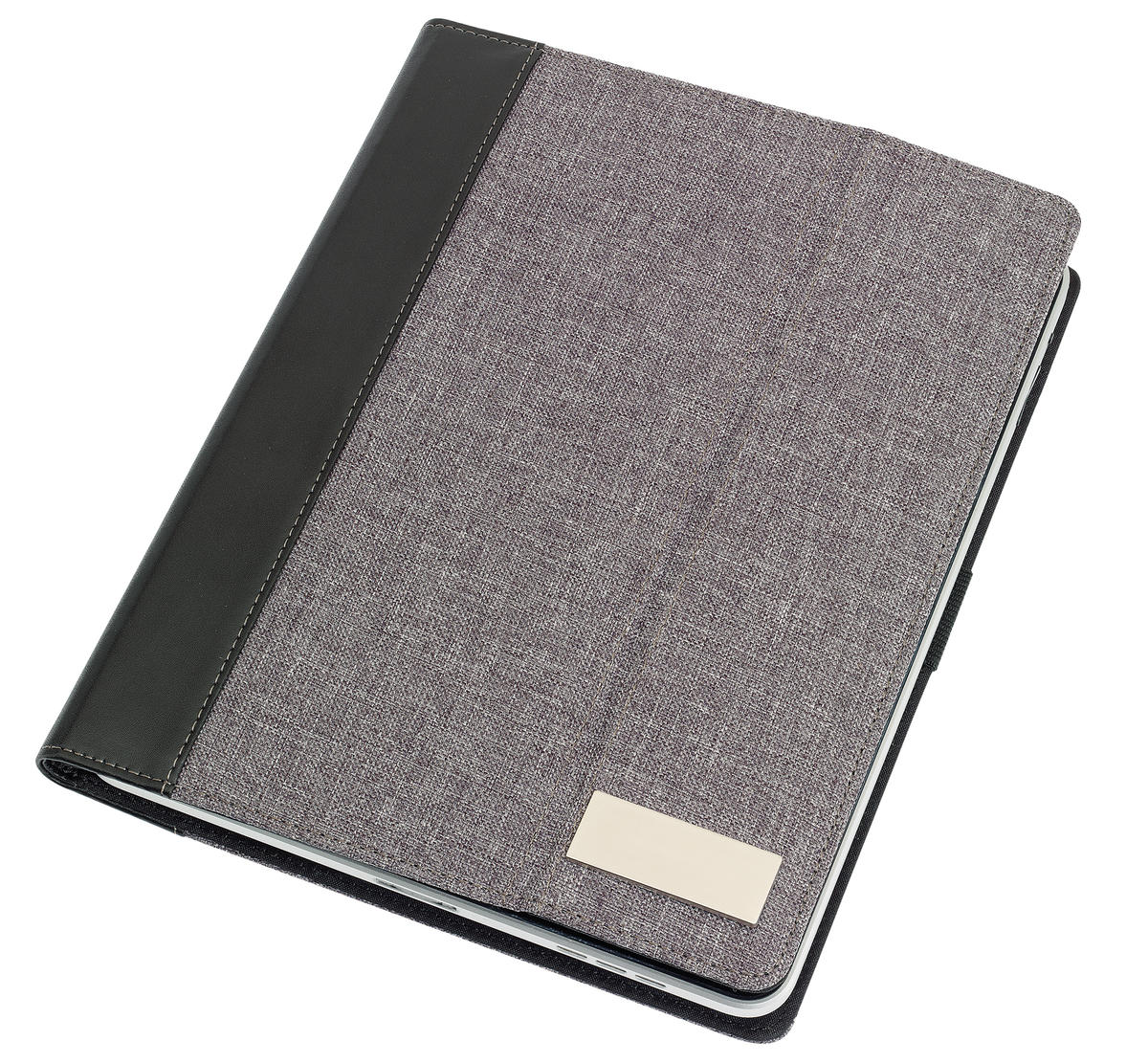 Portfolio na tablet LINEN , okładka może służyć jako stojak na tablet, wewnątrz gumowana podkładka przytrzymująca tablet, odpowiednia na tablet 7´ i 10´, z notesem, pętelką na długopis, metalowa płytka na Twoje logo.