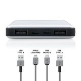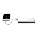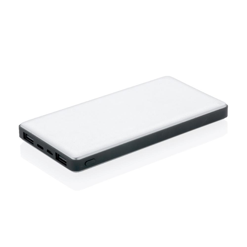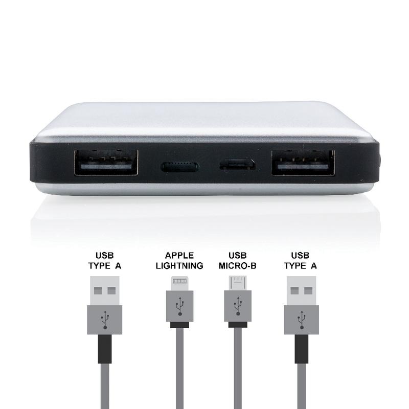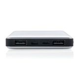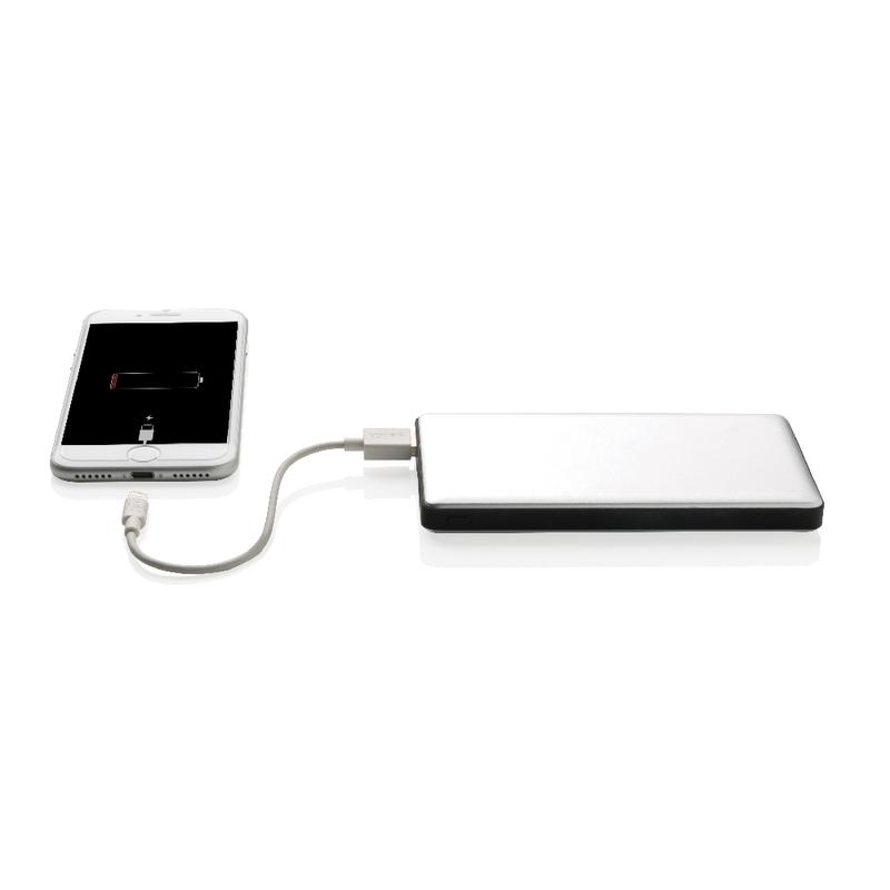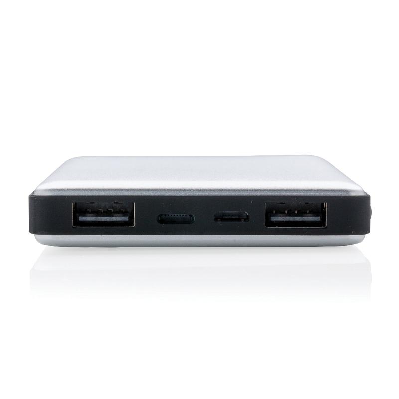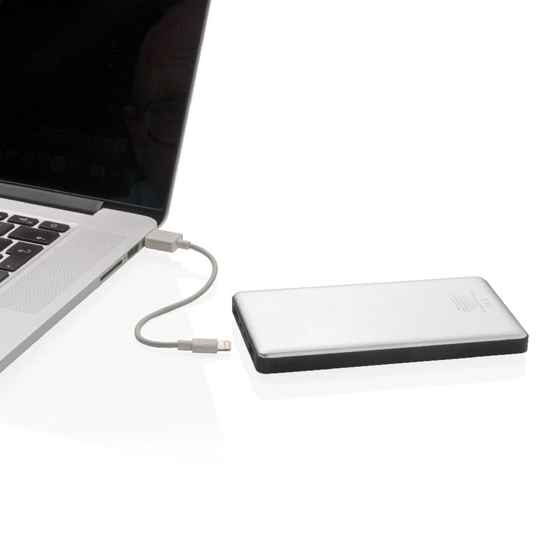 Aluminiowy power bank z trwałą baterią litowo-polimerową 10000 mAh. Ma 2 wyjścia USB i 2 wejścia (micro USB i Lightning), dzięki czemu użytkownicy iOS mogą używać tego samego kabla (nie dołączony) zarówno do ładowania telefonu, jak i do ładowania power banku. Power bank może służyć do ładowania telefonów i tabletów. Lampka wskazuje poziom baterii. Wyjście DC 5V/2.4A, wejście 5V/2A.