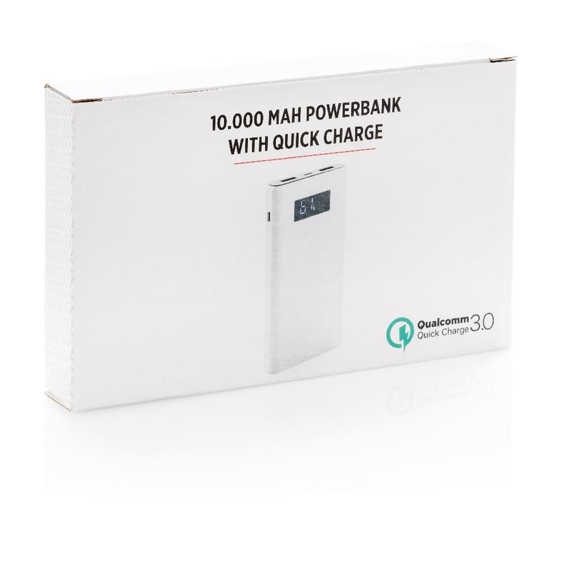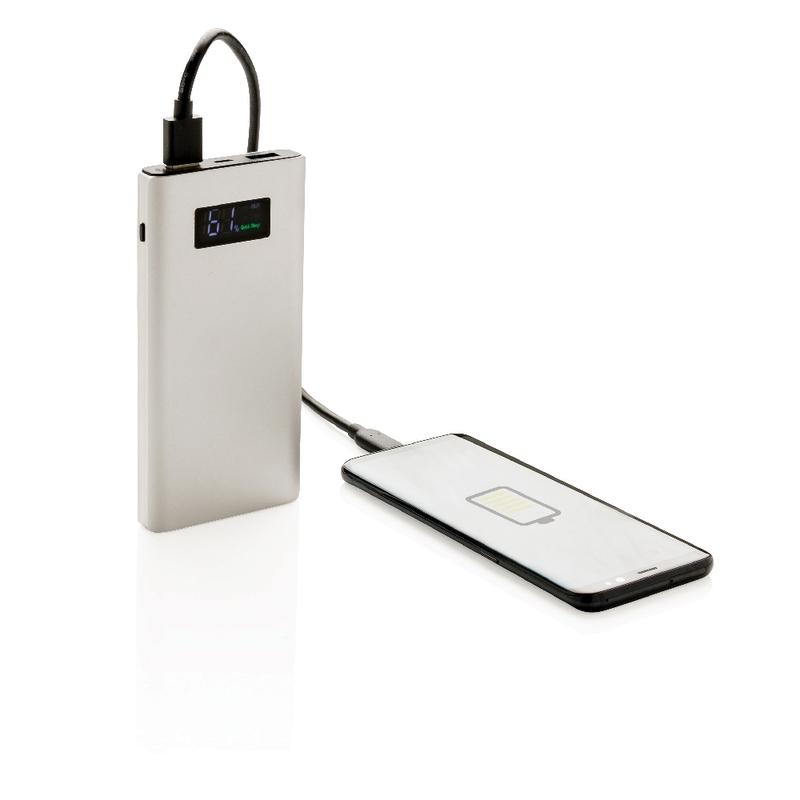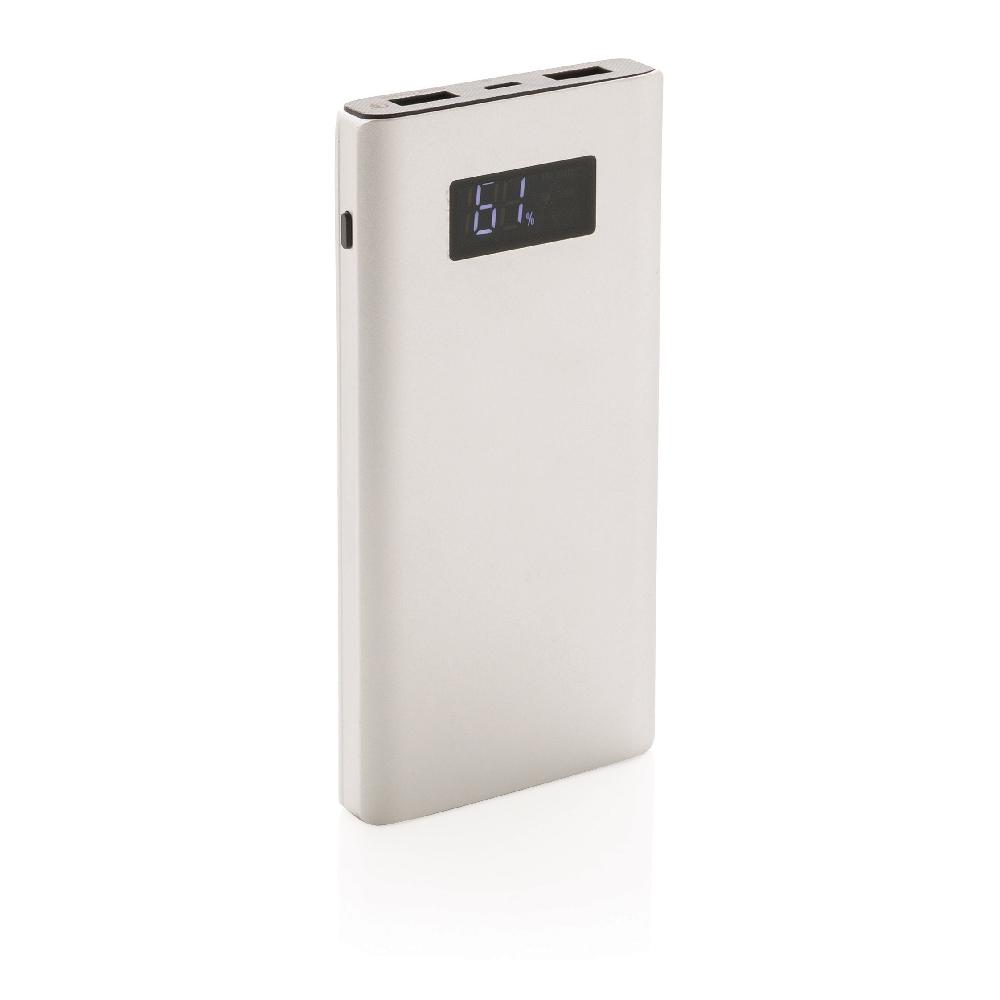 Aluminiowy power bank z trwałą baterią litowo-polimerową 10000 mAh i ekranem LCD do wskazywania poziomu baterii. Ma 2 wyjścia USB, w tym jeden port 3.0 Quick Charge do szybkiego i wydajnego ładowania. Wyjście DC 5V/3A, 9V/2A, 12V/1.5A, wejście 5V/3A. Kabel micro USB w komplecie.