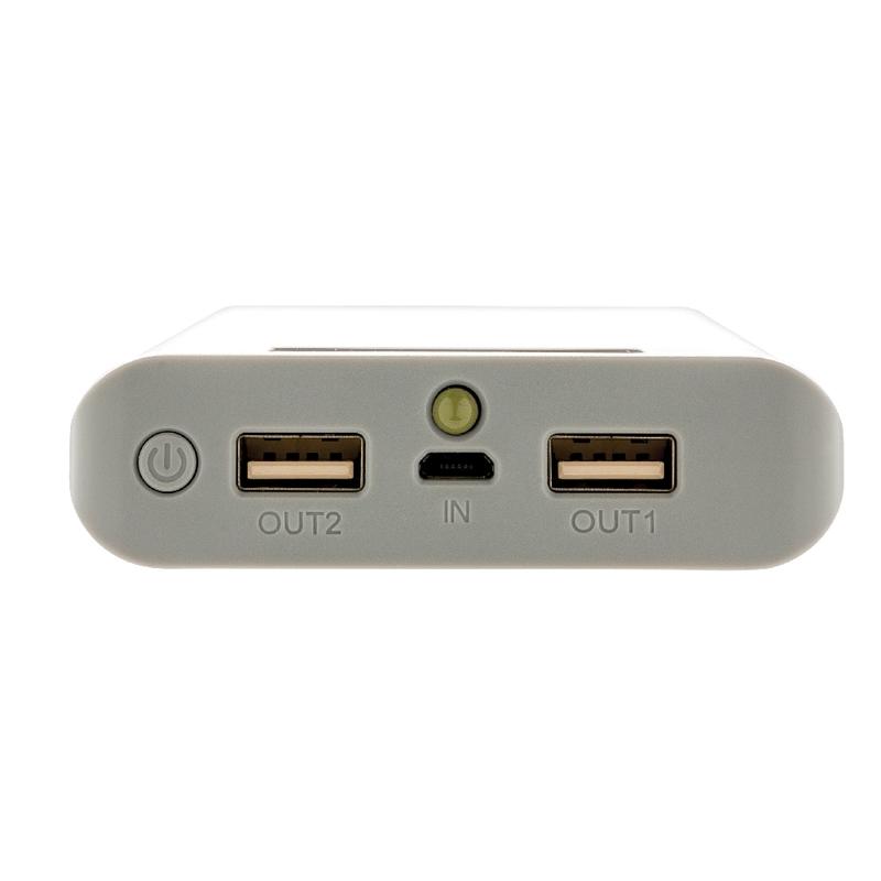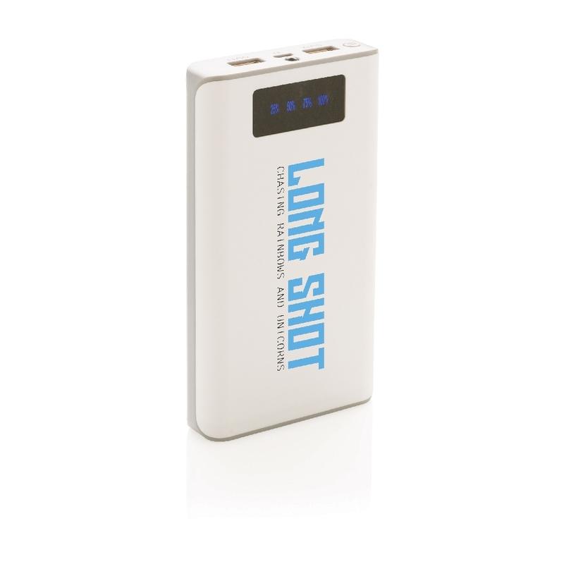Power bank z baterią litową 10000 mAh i wyświetlaczem wskazującym poziom baterii (25%-50%-75%-100%). Power bank można zawsze mieć przy sobie i naładować telefon w każdym miejscu. Posiada 2 porty USB (max. 2.1A) do ładowania dwóch urządzeń jednocześnie. Wyjście 5V/2.6A, wejście 5V/2A. Kabel micro USB w komplecie.
