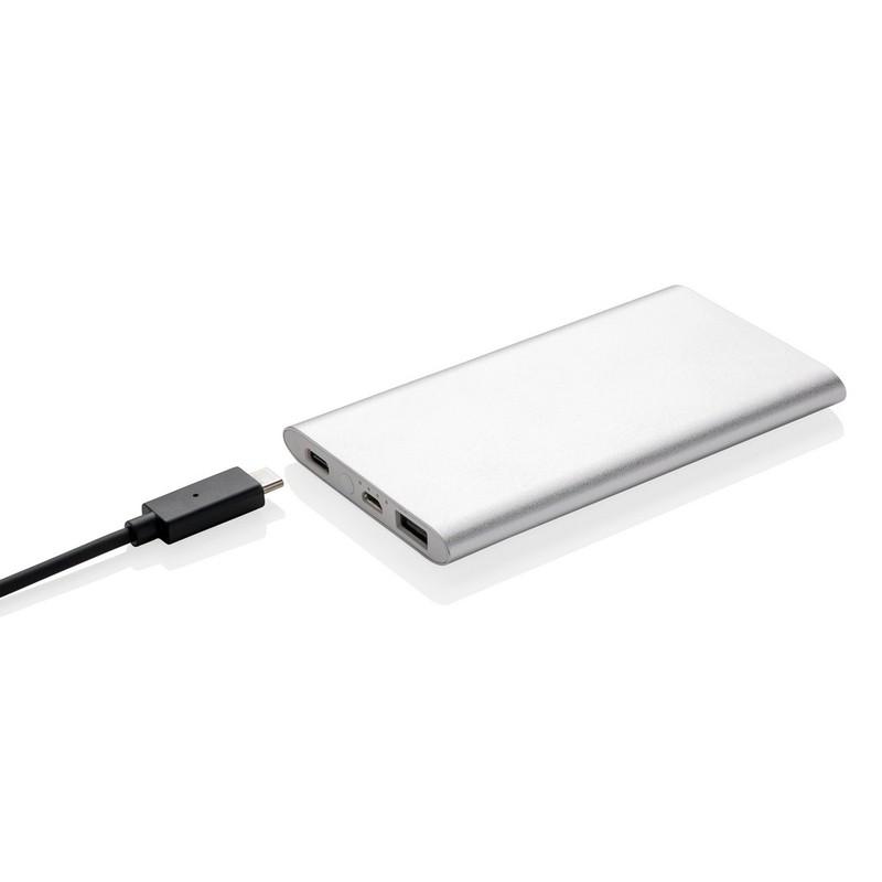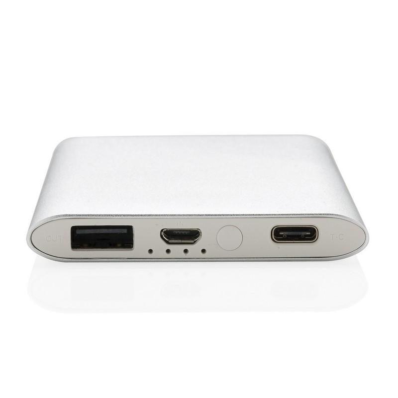 Power bank 4000 mAh wykonany z anodyzowanego aluminium. Posiada zarówno wyjście USB, jak i wyjście typu C 2.0. Umożliwia ładowanie wybranego urządzenia mobilnego przez dowolny kabel. Wyjście 5V/2.1A, wejście 1A.