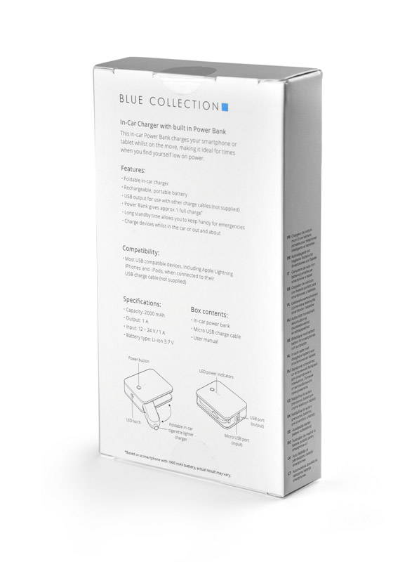 AUTER to prawdziwa innowacja na rynku power banków. Posiada wbudowaną wtyczkę do gniazda zapalniczki samochodowej, która pozwala używać go jako ładowarki podczas jazdy podłączając telefon do portu USB oraz umożliwia ładowanie power banka bezpośrednio z gniazda zapalniczki. Urządzenie jest dodatkowo wyposażone w 4 diody wskazujące poziom baterii, latarkę LED z dwoma trybami świecenia (ciągłym i migającym) oraz port micro USB służący do standardowego ładowania power banka za pomocą dołączonego kabla USB. Gumowana powłoka i nowoczesny design sprawiają, że power bank jest przyjemny dla oka i miły w dotyku. Pojemność 2000 mAh. Wejście 12-24 V / 1 A, wyjście 1 A.