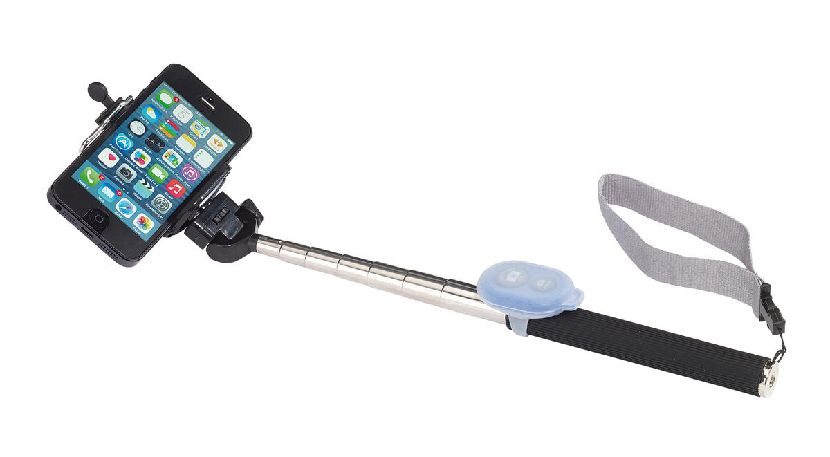 Pilot Bluetooth CLICK do robienia zdjęć typu selfie, z silikonową obręczą do zamocowania na uchwycie teleskopowym, odpowiedni do smartfona z iOS i Android.