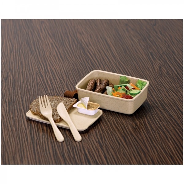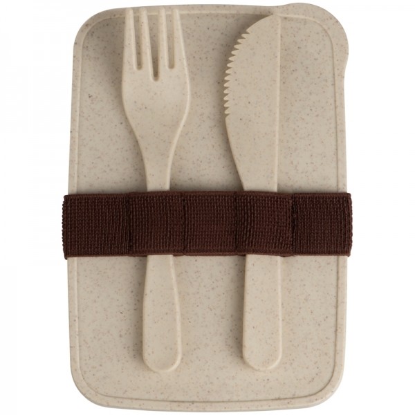 Pudełko do przechowywania i przenoszenia posiłków wykonane z włókna bambusowego. W zestawie z nożem i widelcem. Elastyczna taśma pozwala na mocowanie sztućców do pudełka.