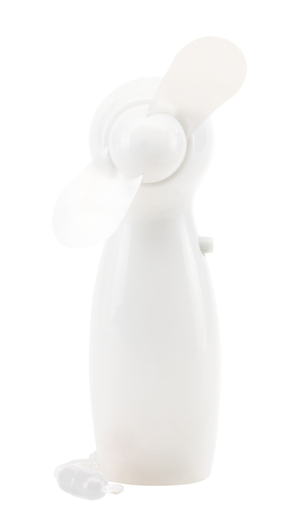 Ręczny wentylator Swirl wraz ze sznureczkiem do zawieszenia na szyi i z bocznym włącznikiem.