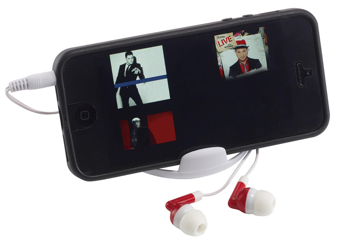 Słuchawki douszne HOLD THE MUSIC , jack 3,5 mm, długość kabla ok. 117 cm, pakowane w pudełko z uchwytem na telefon i matowym wieczkiem.