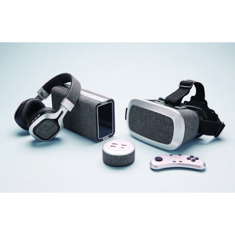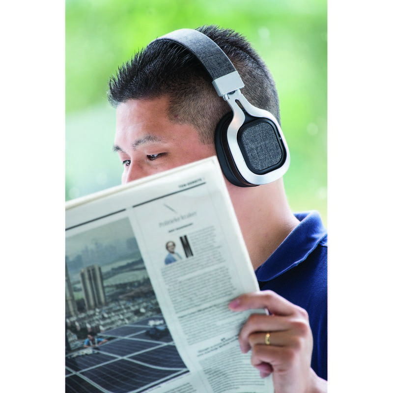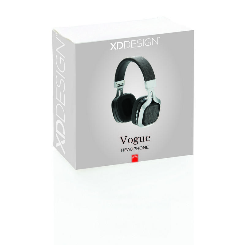 Słuchawki Vogue posiadają modne elementy pokryte materiałem. Zakrywają ucho w całości, dzięki czemu zapewniają doskonałe dopasowanie oraz wyjątkowe wrażenia dźwiękowe. Stylowy materiał na zewnętrznej części, wygodne poduszki PU i opaska sprawiają, że idealnie nadają się do długotrwałego używania. Słuchawki są składane, więc z łatwością można je zabrać ze sobą wszędzie. Korzystają z Bluetooth 4.0, który zapewnia sprawne łączenie z urządzeniem mobilnym w odległości do 10 m. Wbudowana bateria 200 mAh umożliwia słuchanie ulubionej muzyki do 6 h. Funkcja głośnomówiąca do odbierania połączeń telefonicznych. W komplecie kabel micro USB. Wzór zastrzeżony®