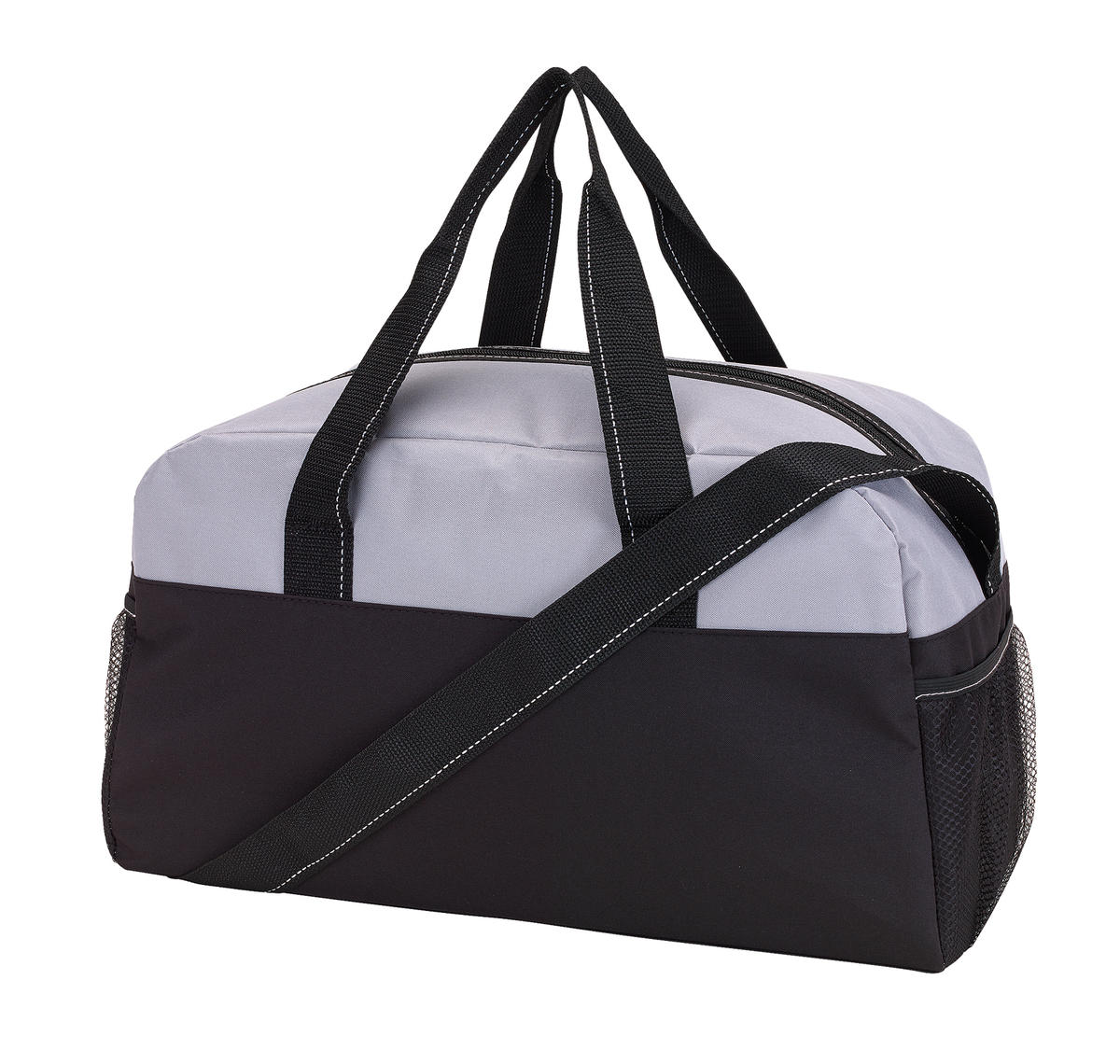 Sportowa torba FITNESS z przestronną komorą główną na zamek błyskawiczny, po bokach 2 siatkowe kieszenie, 2 uchwyty do przenoszenia, regulowany pasek na ramię.