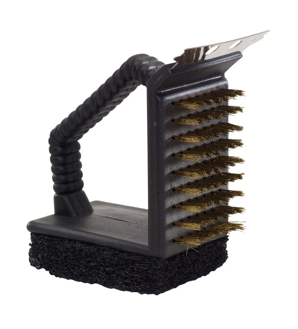 Szczotka do czyszczenia grilla Tip Top z 3 różnymi powierzchniami do czyszczenia: mosiężna szczecina, gąbka PU i metalowa skrobaczka z solidnym plastikowym uchwytem do gruntownego czyszczenia grilla.