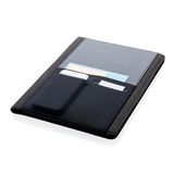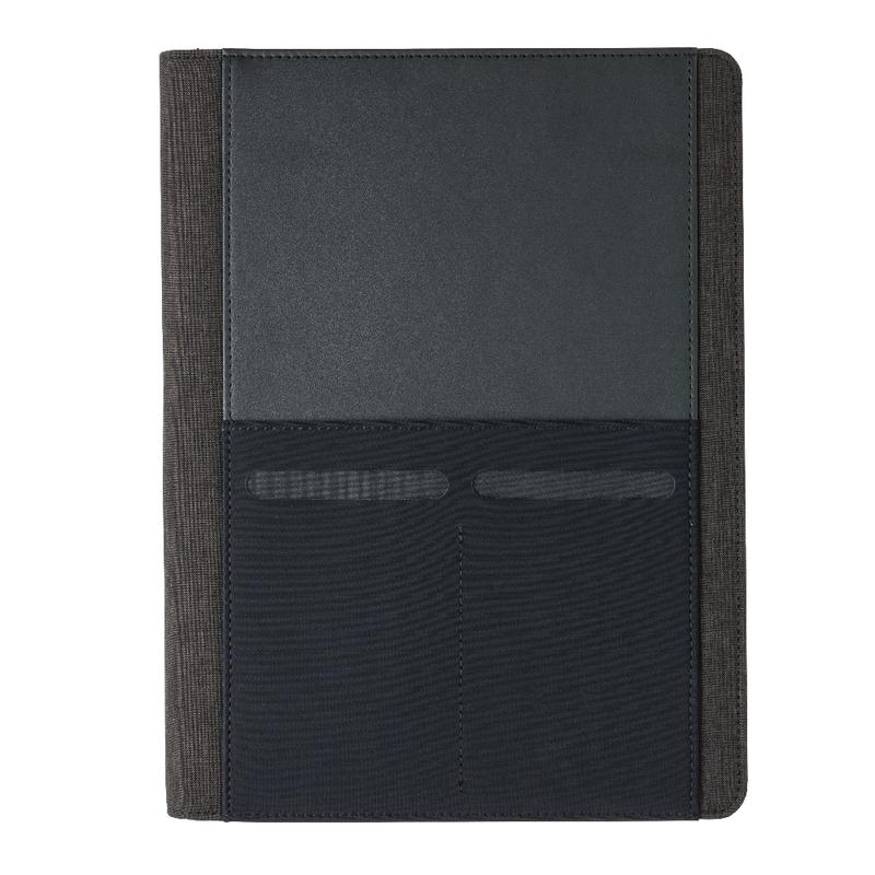 Teczka konferencyjna A4 z 2 przydatnymi kieszeniami oraz dużą przegrodą z przodu. Wewnątrz znajduje się pokrowiec na dokumenty, 4 miejsca na karty oraz miejsce na długopis. Notes A4 z recyklingu w komplecie.