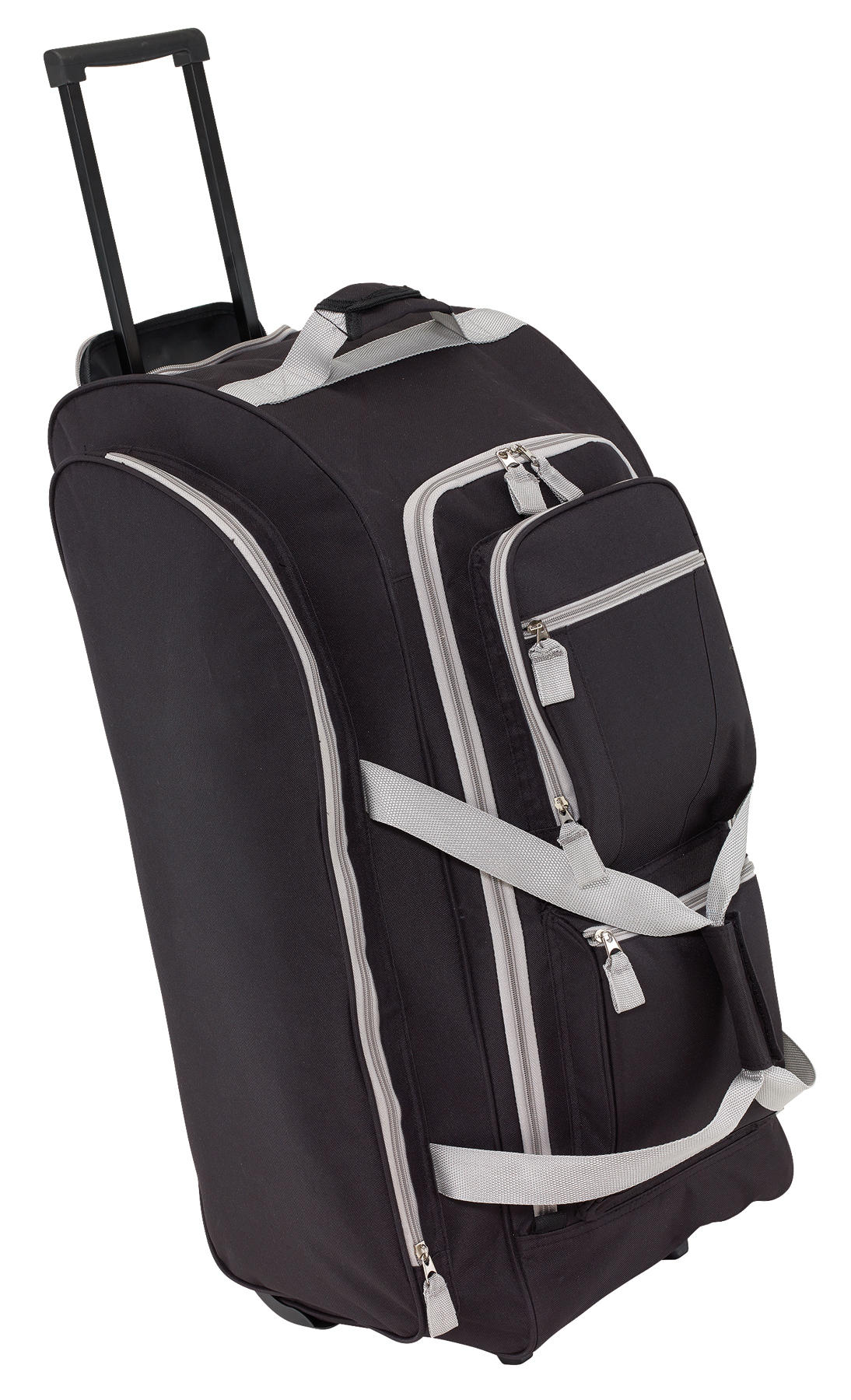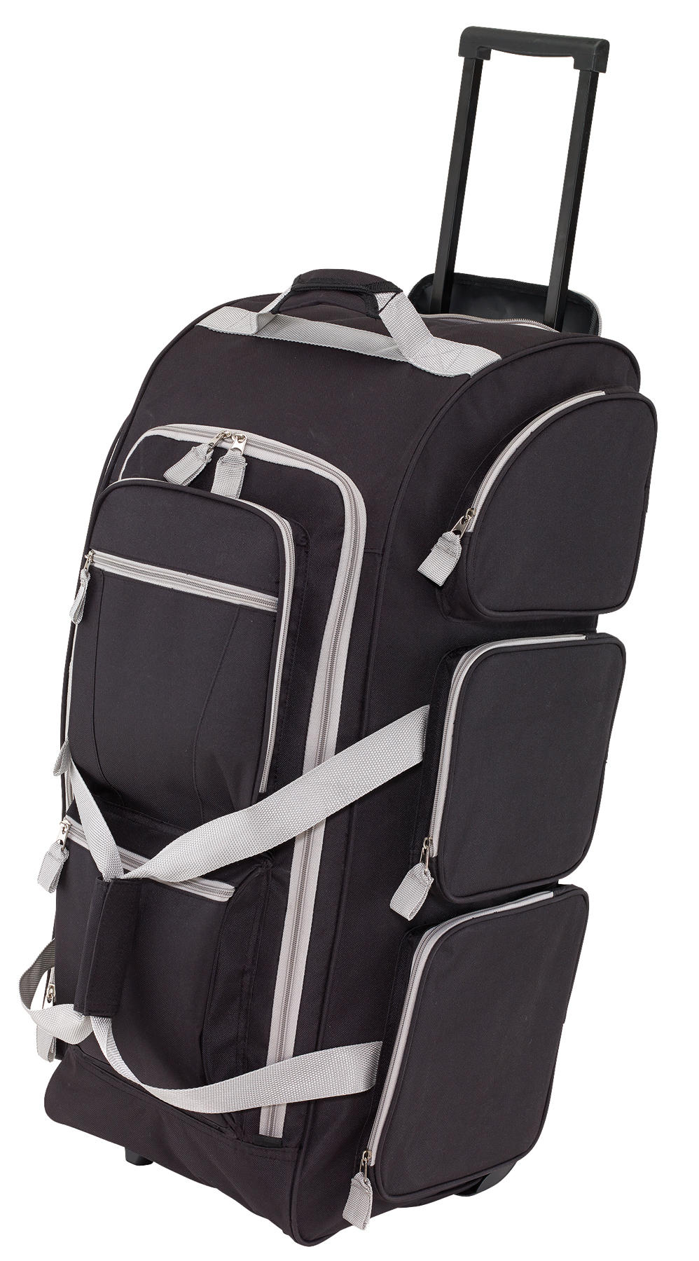 Torba podróżna na kółkach 9P , 3 przednie kieszenie na zamek, przestronna komora główna na zamek z 3 dodatkowymi kieszeniami na zamek, z tyłu 1 kieszeń na zamek, 1 wyściełany uchwyt do przenoszenia, wysuwana rączka do ciągnięcia torby ukryta w kieszonce na zamek, lekko jeżdżące kółka z ochraniaczami na rogi, 2 płozy i stopki do podparcia o podłoże – wiele kieszonek dla lepszej organizacji pakowania.