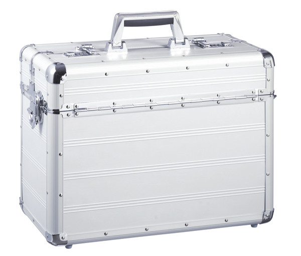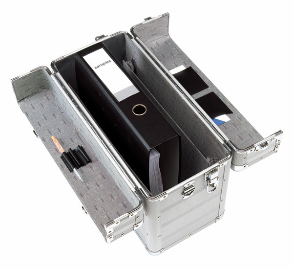 Torba typu pilot, aluminiowa , z zamkiem szyfrowym, tekstylnym wykończeniem, dużą główną komorą, 2 elastycznymi kieszeniami rozdzielającymi, 3 szlufkami na długopisy, zawiera pasek na ramię.