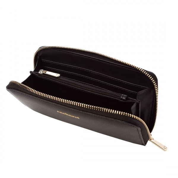 Ponadczasowy portfel wykonany jest w eleganckiej i gładkiej czarnej fakturze i ozdobiony złotym podpisem Cacharela. Portfel ten jest inteligentny i funkcjonalny: znajdują się w nim przegródki na banknoty, monety i karty. To jest idealne musi mieć na szykowny i łatwy dzień.