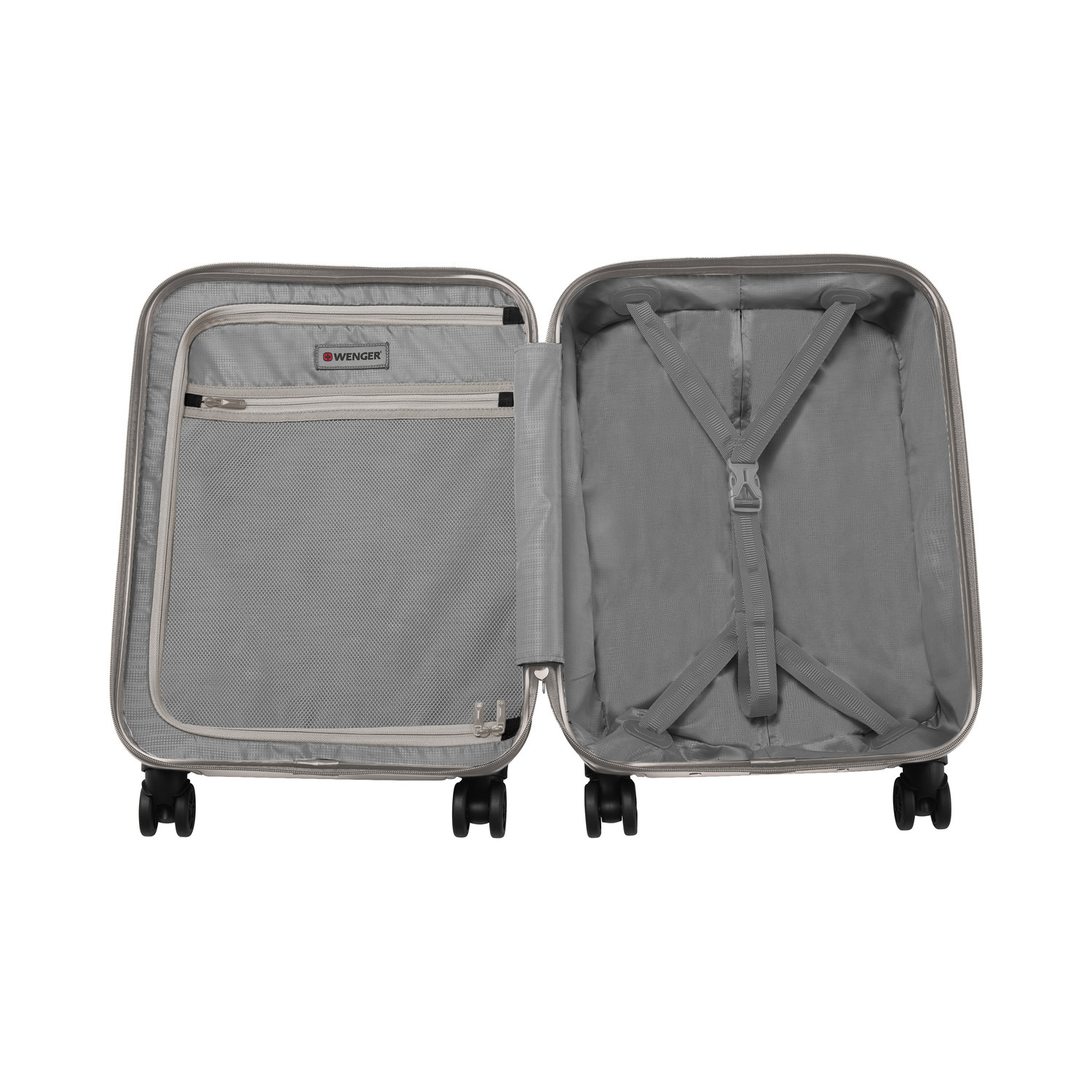Walizka, którą można zabrać ze sobą jako bagaż podręczny do kabiny samolotu. Wykonana z poliwęglanu. Posiada wbudowany identyfikator bagażu z miejscem na nazwisko i adres właściciela, 2 przegrody wewnętrzne zapinane na zamek błyskawiczny i paski, które utrzymują bagaż na miejscu, a także 3-stopniową regulację rączki teleskopowej. Walizka zapinana na 3-cyfrowy szyfr. Objęta 3-letnią gwarancją producenta.